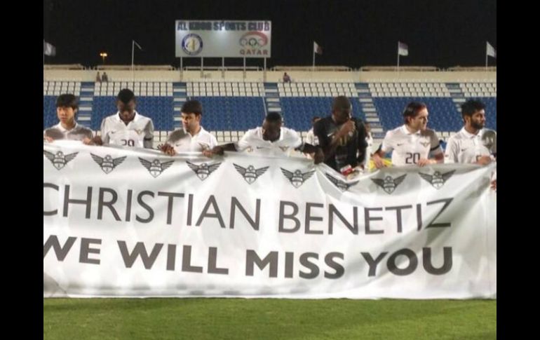 Deportes | Los ex compañeros del ''Chucho'' Benítez posan con una manta Jugadores del Jaish se despiden de Benítez Los ex compañeros del ''Chucho'' Benítez posan con una manta Por: SUN 1 de agosto de 2013 - 13:51 hs Los futbolistas recordaron al ''Chucho'' que recién había llegado al futbol catarí. ESPECIAL / DOHA, QATAR (01/AGO/2013).- Los jugadores del El Jaish de Qatar posaron juntos con una manta en la que se despidieron del goleador ecuatoriano, Christian Benítez, quien falleció el lunes pasado a causa de un paro cardiorrespiratorio. Este jueves el cuerpo del jugador fue trasladado desde Qatar a Ecuador para darle sepultura, por lo que los compañeros de Benítez se unieron para una imagen de despedida que subió el club en su cuenta de Twitter. En la fotografía se ve a algunos integrantes del club con una manta que dice "Te extrañaremos". Incluso, en la cuenta @ElJaishSC se aprecia como avatar una fotografía del atacante. El cuerpo del jugador partió en un avión privado, en un féretro lleno de flores y con una fotografía gigante, acompañado por sus familiares. Temas Futbol Internacional Muertes Decesos de personalidades Christian ''Chucho'' Benítez Lee También César Montes intenta justificar la goleada ante Colombia Colombia exhibe a México con goleada en Arlington México vs Colombia • Momentos destacados • Partido amistoso México cae ante Argentina y termina el sueño mundialista en Chile Recibe las últimas noticias en tu e-mail Todo lo que necesitas saber para comenzar tu día Registrarse implica aceptar los Términos y Condiciones