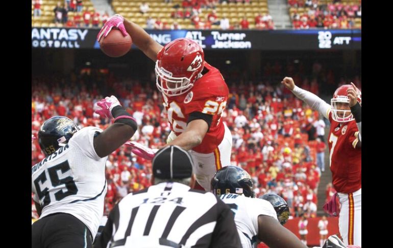 Deportes | Los Jefes se quedan con la victoria de 42-20 ante los Jaguares de Jacksonville Kansas City sigue sumando victorias Los Jefes se quedan con la victoria de 42-20 ante los Jaguares de Jacksonville Por: AP 24 de octubre de 2010 - 16:04 hs La defensa de los Jaguares no pudo parar el ataque terrestre de lo Jefes de Kansas. AP / KANSAS CITY, MISSOURI (24/OCT/2010).- El defensivo Derrick Johnson lideró un ataque por tierra regresando una intercepción hasta la zona de las diagonales y el mariscal de campo Matt Cassel logró dos pases de anotación para que los Jefes de Kansas City vencieran 42-20 a los Jaguares de Jacksonville. Para los Jefes (4-2) fue su ataque por tierra más productivo al conseguir 236 yardas y tres anotaciones, para sumar su cuarta victoria en lo que va de campaña. Johnson regresó una interceptación 15 yardas para anotación durante el tercer cuarto para darle a los Jefes una ventaja de 28-20 y prácticamente congelar las acciones para los Jaguars, que luego ya no tuvieron opción de volver a entrar en el partido. Mientras que Cassel completó 13 de 18 pases para sumar 193 yardas con dos pases de "touchdown". Los Jaguares (3-4) jugaron con su mariscal de campo Todd Bouman, quien no había lanzado pase de anotación en temporada regular desde la campaña del 2005. Bouman fue firmado esta semana después de que el titular David Garrard sufrió una conmoción y el reserva Trent Edwards se lesionó el dedo pulgar en una derrota ante los Titanes de Tennessee, el lunes por la noche. Bouman, de 38 años de edad y que no había tenido un inicio desde el 2001, estuvo fuera de la liga el año pasado, y esta vez completó 18 de 34 pases para 222 yardas con dos anotaciones y dos "touchdowns", que no fueron suficientes para evitar la derrota. Temas NFL Futbol Americano Jaguares de Jacksonville Jefes de Kansas City Lee También Muere Miguel Ángel Russo, entrenador de Boca Juniors ¿Dónde ver EN VIVO Eagles vs. Giants? Futbol hoy 9 de octubre de 2025: ¿Dónde ver los partidos en vivo? Todas las selecciones que han calificado al Mundial 2026 hasta hoy Recibe las últimas noticias en tu e-mail Todo lo que necesitas saber para comenzar tu día Registrarse implica aceptar los Términos y Condiciones