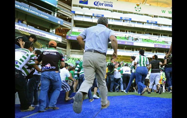 Deportes | Este día se reúnen para tratar el tema La FMF evaluará si amplía seguridad en estadios Los dirigentes del futbol mexicano condenan la violencia que provocó la suspensión del encuentro entre Santos y Morelia Por: AP 22 de agosto de 2011 - 01:10 hs Tras escuchar las detonaciones, los aficionados saltaron a la cancha y corrieron hacia los vestidores para encontrar un refugio. EFE / CIUDAD DE MÉXICO (22/AGO/2011).- Los dirigentes del futbol mexicano condenaron los hechos violentos que provocaron la suspensión del partido entre Santos y Morelia y convocaron a una reunión este día para evaluar posibles medidas de seguridad. Un tiroteo se desató el sábado afuera del Estadio Corona en Torreón, cuando los ocupantes de tres camionetas no acataron las órdenes de elementos de las fuerzas armadas, según informó la policía municipal. Los jugadores salieron corriendo a buscar refugio en los vestuarios y cientos de espectadores invadieron la cancha tratando de alejarse del peligro. “Tenemos que estar unidos contra la violencia, tenemos que poner un ‘hasta aquí’”’, dijo el presidente de la Federación Mexicana de Futbol, Justino Compeán, que convocó tras el tiroteo a una conferencia de prensa en Bogotá, donde asistía al Mundial Sub-20. Un policía sufrió heridas, pero las autoridades dijeron que estaba en condición estable. “Lo que sucedió fue una situación fuera del estadio, pero finalmente afecta al futbol”, dijo el secretario general de la Federación, Decio de María. “Afortunadamente no hubo incidentes dentro del estadio”. De María dijo que hoy habrá una reunión en la FMF para determinar qué medidas adicionales se pueden tomar. Temas Futbol Mexicano FMF Torneo Apertura 2011 Recibe las últimas noticias en tu e-mail Todo lo que necesitas saber para comenzar tu día Registrarse implica aceptar los Términos y Condiciones