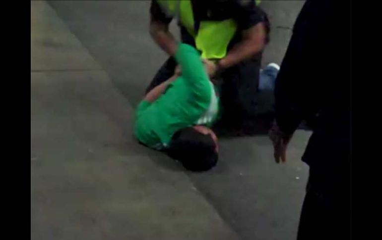 Deportes | Circula un video donde son sometidos dos aficionados en el juego de México La policía de San Diego se excede en fuerza Circula un video donde son sometidos dos aficionados en el juego de México Por: NTX 31 de marzo de 2011 - 17:00 hs SAN DIEGO, CALIFORNIA (31/MAR/2011).- Un aficionado captó un video que muestra una escena de aparente fuerza excesiva de policías de San Diego para someter a dos fanáticos de la Selección Mexicana de futbol en el estadio Qualcomm, durante el juego ante Venezuela. Ahí se muestra a dos policías de evidente mayor peso que los aficionados, quienes someten con lujo de fuerza a dos latinos quienes visten camiseta versión verde de la selección mexicana, entre llaves inmovilizadoras de lucha y judo. Uno de los dos policías tuerce el brazo derecha de uno de los dos aficionados y sorpresivamente azota con fuerza contra el piso de concreto el rostro del latino que no muestra resistencia. Otro aficionado de la selección mexicana, que observa la escena, reprocha al policía por su fuerza excesiva y el agente responde que el sometido 'no se detuvo'. Entre los primeros comentarios al video, algunos justifican a los policías argumentando que los dos latinos sometidos se resistían a ser arrestados, aunque en el video los detenidos no parecen oponerse. Otros usuarios de YouTube en cambio expresan con sarcasmo que los detenidos se resistían a dejar de respirar y que la última vez que se vieron escenas como esas 'ocurrían en Arizona, no en California'. Temas Selección mexicana FMF Recibe las últimas noticias en tu e-mail Todo lo que necesitas saber para comenzar tu día Registrarse implica aceptar los Términos y Condiciones