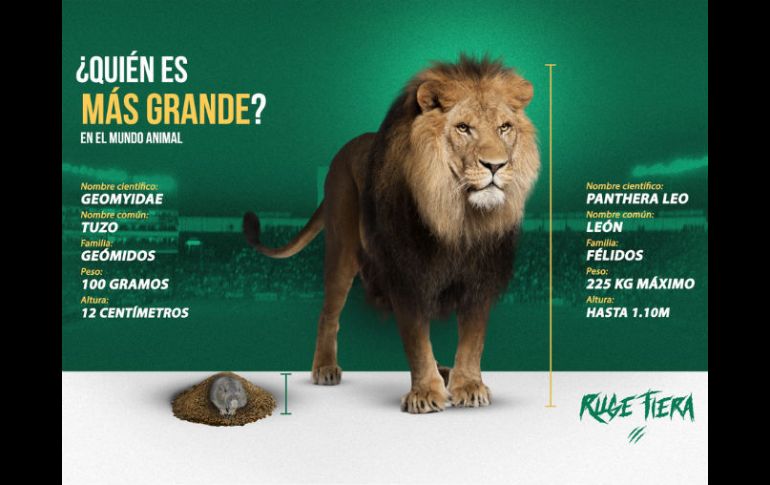 Deportes | Previo a su choque en el estadio Hidalgo, hacen una comparación entre un león y un tuzo León responde a Tuzos con desplegado Previo a su choque en el estadio Hidalgo, hacen una comparación técnica entre un león y un tuzo Por: SUN 20 de febrero de 2015 - 15:28 hs '¿Quién es más grande? en el mundo animal...' se titula el desplegado de los esmeraldas. TWITTER / @clubleonfc CIUDAD DE MÉXICO (20/FEB/2015).- Previo a su choque en el estadio Hidalgo, los esmeraldas de León lanzaron un rugido con una comparación técnica entre un león y un tuzo, donde el primero sale avante. "¿Quién es más grande? en el mundo animal..." se titula el desplegado del León, donde deja ver su superioridad en la cadena alimenticia, al menos en la cancha de la vida salvaje. Sin embargo, el rugido del León sería una respuesta a las declaraciones de Jurgen Damn, jugador de los Tuzos, en las que señala quién el más grande de los 'hermanitos' del Grupo Pachuca, pero al ritmo del 'Turn Down for what', una tendencia de duelos verbales que se ha vuelto viral en redes sociales. -¿Quién es más grande?- "Claro que Pachuca, tenemos más títulos y una sudamericana", presumió Damn. De este modo, los felinos llegan a la madriguera de los Tuzos con 8 puntos ( dos triunfos, dos empates y dos derrotas), mientras que el cuadro del Pachuca se perfila con 7 unidades ( dos triunfos, un empate y una derrota); ambos equipos rodarán el esférico este sábado en punto de las 20:06 horas, en partido correspondiente a la fecha 7 del Clausura 2015. Temas Futbol Mexicano Tuzos de Pachuca Panzas Verdes de León Liga MX Clausura 2015 Lee También Difícil cierre para el peso; rompe el techo de las 19 unidades por dólar ¿Quién ganará el partido entre las América y Chivas? Esto dice la IA México vs. Argentina: Hora de alzar el pecho La sinfonía teutona suena en Sinsheim Recibe las últimas noticias en tu e-mail Todo lo que necesitas saber para comenzar tu día Registrarse implica aceptar los Términos y Condiciones