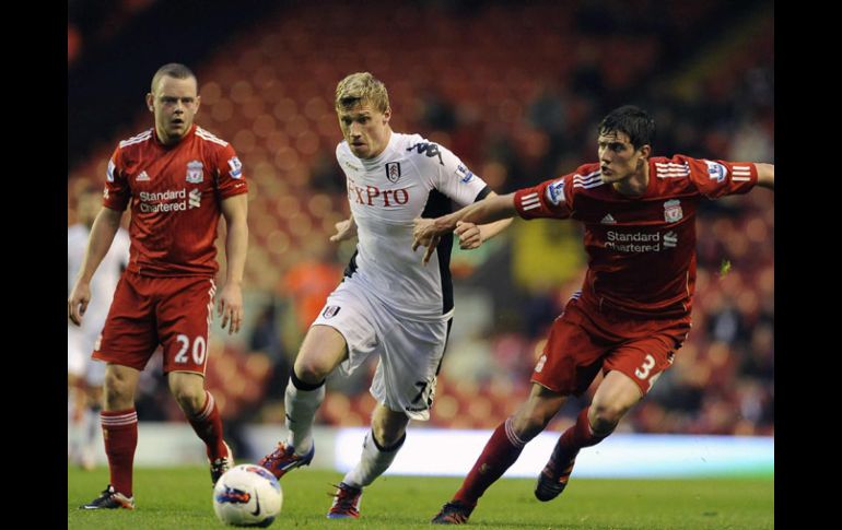 Deportes | El cuadro de los Reds pierde en casa ante el Fulham en Liga Premier Liverpool ve lejos Europa El cuadro de los Reds pierde en casa ante el Fulham en Liga Premier Por: NTX 1 de mayo de 2012 - 18:17 hs Pavel Porgrebnyak (centro) Trata de quitarse la marca de dos elementos del Liverpool. REUTERS / LIVERPOOL, INGLATERRA (01/MAY/2012).- El Liverpool perdió en casa 0-1 ante el Fulham en el estadio de Anfield, en duelo por la fecha 34 de la Liga Premier de Inglaterra, por lo que se alejó de los lugares de la próxima Europa League. La única anotación del partido llegó luego que el eslovaco Martin Skrtel metiera el balón en propia puerta al minuto cinco, jugada que terminó por pesar en las aspiraciones de los Reds a lo largo del partido. Con la derrota, los comandados por el escocés Kenneth Dalglish se mantienen en el octavo puesto de la tabla general con 49 puntos, mismos que el Fulham, aunque con mejor diferencia de goles para el Liverpool. Desde los primeros minutos, el Fulham intentó adueñarse del balón, por lo que comenzó a presionar a la defensiva rival, que a los cinco minutos cometió un error para propiciar el autogol por parte de Skrtel, que puso en el marcador el 0-1. Luego de verse abajo en la pizarra, el Liverpool se encendió a la ofensiva y llegó en varias ocasiones a la meta defendida por el australiano Mark Schwarzer, aunque sin conseguir el empate deseado. Para la segunda mitad, el partido se volvió prácticamente 100 por ciento ofensivo luego que el Fulham aumentó sus llegadas al área de los locales, no obstante, el marcador ya no se movió. Resultados de este martes por la fecha 34 de la Liga Premier: Liverpool 0-1 Fulham Stoke City 1-1 Everton Temas Liga Premier Futbol Internacional Futbol Inglés Liverpool Lee También Colombia exhibe a México con goleada en Arlington México vs Colombia • Momentos destacados • Partido amistoso México cae ante Argentina y termina el sueño mundialista en Chile México vs Argentina • Momentos Destacados • Cuartos de Final • Mundial Sub-20 Recibe las últimas noticias en tu e-mail Todo lo que necesitas saber para comenzar tu día Registrarse implica aceptar los Términos y Condiciones