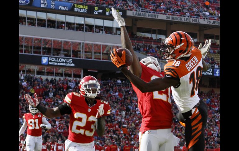 Deportes | Kansas City es apaleado por los Bengalíes de Cincinnati 28-6 Los Jefes siguen sumando derrotas Kansas City es apaleado por los Bengalíes de Cincinnati 28-6 Por: AP 18 de noviembre de 2012 - 15:19 hs Acció del partido donde A.J. Green atrapa un pase para anotación. AP / KANSAS CITY, MISOURI (18/NOV/2012).- Andy Dalton lanzó para 230 yardas y tres touchdowns, A.J. Green atrapó un pase de anotación por noveno partido seguido y los Bengalíes de Cincinnati despacharon el domingo 28-6 a los Jefes de Kansas City. Green terminó con seis pases atrapados para 91 yardas en otra gran exhibición, mientras que BenJarvus Green-Ellis consiguió 101 en acarreos y un touchdown para la segunda victoria consecutiva de los Bengalíes (5-5), después de sufrir cuatro derrotas al hilo. Los cuatro próximos rivales de Cincinnati son equipos con saldo negativo en sus marcas. Pero ninguno de esos oponentes son tan malos como los Jefes (1-9), que encajaron su séptimo revés seguido. Las 87 yardas por tierra de Jamaal Charles fueron lo único rescatable para Kansas City. Temas NFL Futbol Americano Bengalíes de Cincinnati Jefes de Kansas City Lee También Futbol hoy 19 de octubre de 2025: ¿Dónde ver los partidos en vivo? Robert Dante Siboldi arremete contra el arbitraje tras derrota ante Chivas Fernando Quirarte atribuye victorias de Chivas al respaldo de la directiva Cruz Azul vs América • Momentos Destacados • Jornada 13 • Apertura 2025 Recibe las últimas noticias en tu e-mail Todo lo que necesitas saber para comenzar tu día Registrarse implica aceptar los Términos y Condiciones