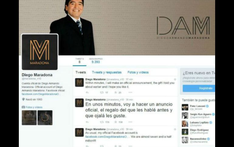 Deportes | Una cuenta falsa en Twitter se hizo pasar por el astro argentino Maradona celebra su cumpleaños con escándalo en redes La hija mayor del ex jugador, Dalma, dijo que su papá no tenía Twitter y que la cuenta era falsa Por: EFE 30 de octubre de 2015 - 07:24 hs La cuenta fue ratificada por Rashid Ali Garcia, quien se presenta como el representante árabe del jugador. TWITTER / maradona_n10_ BUENOS AIRES, ARGENTNA (30/OCT/2015).- El astro argentino del futbol mundial Diego Maradona vivió hoy, en el día de su cumpleaños número 55, una jornada intensa debido a una cuenta apócrifa de Twitter que se hizo pasar por él. "Bienvenidos a mi primer cuenta oficial en Twitter. Gracias por estar siempre a mi lado y darme tanto amor", decía el mensaje en español e inglés que le atribuía al capitán de la selección albiceleste en el Mundial de México 1986 la cuenta @maradona_n10. Con menos de un día activa, esta cuenta había alcanzado más de 378 mil seguidores, además de muchos mensajes de bienvenida a la red social y salutaciones por su cumpleaños. Sin embargo, fue la propia hija mayor del ex jugador, Dalma, la que aclaró el tema al expresar en su cuenta verificada: "Para todos los que me preguntan, mi papá no tiene Twitter. Ese que está circulando se cerrará en breve". La cuenta en cuestión ayer fue ratificada, desde Dubai, por Rashid Ali Garcia, quien se presenta como el representante árabe del jugador. Además anuncia la creación de un nuevo sitio oficial diegomaradonaofficial.com. Temas Futbol Internacional Diego Armando Maradona Dalma Maradona Twitter Escándalos en redes sociales Lee También Dólar sube ante tensiones comerciales y preocupaciones fiscales Bad Bunny permanece sentado durante "God Bless America" y enciende las redes México busca frenar el paso perfecto de Argentina en Mundial Sub-20 Lista actualizada de selecciones que ya clasificaron al Mundial 2026 Recibe las últimas noticias en tu e-mail Todo lo que necesitas saber para comenzar tu día Registrarse implica aceptar los Términos y Condiciones