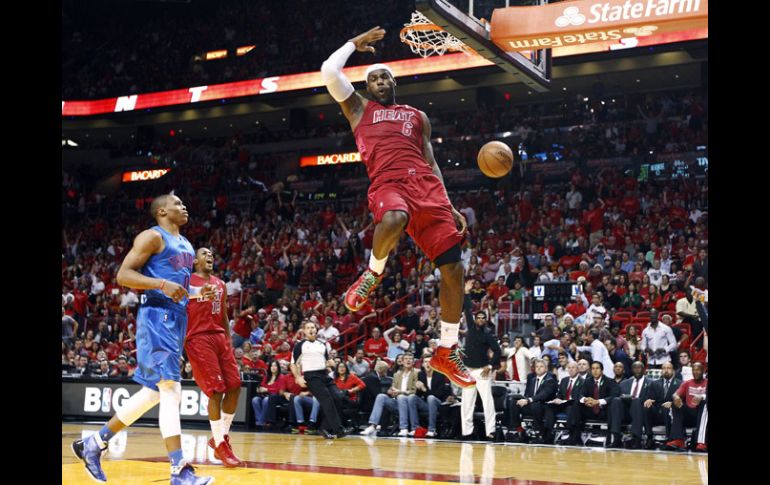 Deportes | Se repite la última final de la NBA con victoria para Miami 103-97 Miami vence al Thunder Se repite la última final de la NBA con victoria para Miami 103-97 Por: EFE 25 de diciembre de 2012 - 20:21 hs LeBron James clava el balón durante el juego ante el Thunder de Oklahoma. AP / MIAMI, FLORIDA (25/DIC/2012).- El alero estrella LeBron James lideró una vez más a los Heat de Miami, que en su primer duelo contra los Thunder de Oklahoma City desde que disputaron el título de campeones de la NBA, fueron superiores y vencieron por 103-97 en el duelo estelar navideño. El partido disputado en el American Airlines Arena, de Miami, el tercero de la jornada del Día de Navidad, mostró a un James pletórico que aportó 29 puntos, nueve asistencias, ocho rebotes, dos recuperaciones de balón, perdió tres, y puso un tapón. Junto a James, el escolta Dwyane Wade mantuvo su eficacia con 21 puntos, mientras que el base Mario Chalmers sumó 20 tantos en una gran demostración de juego. El pívot Chris Bosh logró 16 puntos, seis rebotes y dos asistencias, que lo llevaron a ser el cuarto jugador de los Heat que tuvieron números de dos dígitos. Los Heat, que tuvieron la ventaja parcial de seis puntos al concluir la primera parte (54-48), no decidieron el triunfo hasta los últimos 15 segundos del tiempo reglamentario cuando se pusieron con parcial de 100-97, gracias a los dos tiros de personal que anotó el veterano escolta Ray Allen. El triunfo fue el quinto consecutivo de los Heat (19-6), que empataron la mejor marca en la historia del equipo para un comienzo de temporada de 25 partidos. Los Heat también consiguieron la quinta victoria consecutiva en los duelos contra los Thunder desde que disputaron las pasadas Finales de la NBA que ganaron por 4-1. El equipo de Miami, que tiene también la mejor marca de la Conferencia Este, logró un 48 (38-80) por ciento de acierto en los tiros de campo, el 29 (8-28) de triples y el 100 (19-19) desde la línea de personal, comparados al 42 (30-71), 31 (5-16) y 84 (32-38), respectivamente, de los Thunder. "Era el partido que te motiva a ganar, no sólo por la calidad del rival, sino por lo que significa jugarlo el Día de Navidad, que hace que el sacrificio realizado por los jugadores al estar alejados de sus familias se vea compensado", comentó el entrenador de los Heat, Erik Spoelstra. El alero Kevin Durant volvió a ser el líder encestador de los Thunder (21-6) con 33 puntos, siete rebotes y tres asistencias, mientras que Westbrook aportó un doble-doble de 21 puntos, 11 rebotes y tres asistencias, pero falló 14 de 19 tiros de campo, y perdió cinco balones de los 16 que registró el equipo. Ambos jugadores tuvieron también la oportunidad de haber forzado la prórroga si llegan a acertar con los dos intentos de triples que hicieron y fallaron en los últimos segundos del tiempo reglamentario. El ala-pívot congoleño nacionalizado español Serge Ibaka y el escolta Kevin Martin anotaron 15 puntos cada uno y completaron la lista de los cuatro jugadores de los Thunder que lograron números de dos dígitos. Ibaka jugó 37 minutos en los que anotó 6 de 10 tiros de campo, falló un intento de triple, acertó 3 de 4 lanzamientos de personal, capturó seis rebotes y puso un tapón, pero no pudo evitar lo que fue la segunda derrota consecutiva de los Thunder, primera vez que lo permiten desde que comenzó la nueva temporada. Temas NBA Basquetbol LeBron James Miami Heat Lee También Astros se instalan en la final de zona de la LNBP Selección Mexicana | James Rodríguez sobre el Tricolor: "Hablan mucho" México vs Colombia: ¿Quién ganará el partido según la IA? Astros de Jalisco doblega a Xalapa y se pone a un juego de la Final de Zona Recibe las últimas noticias en tu e-mail Todo lo que necesitas saber para comenzar tu día Registrarse implica aceptar los Términos y Condiciones