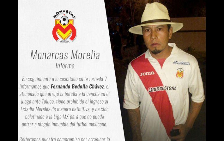 CIUDAD DE MÉXICO (20/FEB2017).- En un breve comunicado la escuadra de Monarcas Morelia dio a conocer quién fue el sujeto que aventó una botella al campo que golpeó al futbolista Rubens Sambueza, del Toluca.En su cuenta oficial de Twitter, Monarcas señaló que Fernando Bedolla Chávez fue la persona que lanzó el objeto a la cancha, y por lo tanto se le ha vetado el ingreso al estadio José María Morelos y Pavón, ubicado en la capital michoacana.Además, Monarcas informó en la publicación que se ha enviado la imagen de Bedolla Chávez a la Liga MX para que sea boletinado y no pueda acceder a ninguno de los estadios del futbol mexicano.