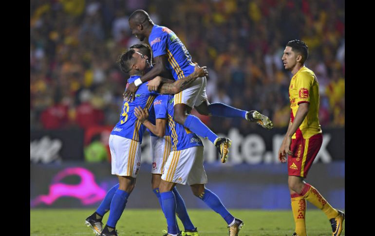 Jugadores de Tigres celebran uno de sus tres goles ante Morelia. MEXSPORT / I. Ortiz