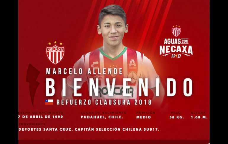 AGUASCALIENTES, AGUASCALIENTES (07/SEP/2017).- El equipo de Necaxa oficializó este jueves el fichaje del joven chileno Marcelo Allende, quien se incorporará al conjunto hidrocálido hasta enero para encarar el Torneo Clausura 2018 de la Liga MX. "La Directiva de Club Necaxa anunció esta mañana a Marcelo Iván Allende Bravo como nuevo refuerzo del equipo de Aguascalientes", informó la asociación en un comunicado.El equipo destacó que: "El jugador chileno nacido el 7 de abril de 1999 en Pudahuel, Chile, se integrará al plantel de los Rayos en el próximo Torneo Clausura 2018 de la Liga MX".El mediocampista andino llegará a Rayos proveniente del Club Deportes Santa Cruz de la Segunda División del futbol chileno.Destacó que a pesar de su juventud, "Chelo" ya fue seleccionado y capitán Sub 17 en la Copa del Mundo 2015; además cuenta con una breve experiencia de entrenamiento con el Arsenal de Inglaterra, que buscaba su fichaje pero no se concretó.De este modo, el equipo dirigido por Ignacio Ambriz suma un chileno más en su plantel, luego que se encuentran Manuel Iturra, Igor Lichnovsky, Víctor Dávila y Felipe Gallegos.