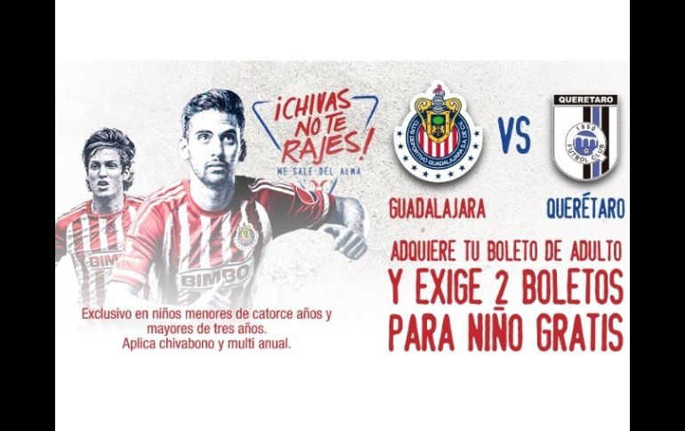 Deportes | La directiva rojiblanca propone entrada gratis a niños comprando un boleto de adulto Niños gratis para ver a Chivas Con la promoción se pretende que haya una buena entrada en el estadio Omnilife para ver al Rebaño enfrentar a Querétaro Por: EL INFORMADOR 19 de septiembre de 2015 - 15:42 hs El apoyo de la afición es importante para que Chivas convierta el Estadio Omnilife en una Fortaleza en el duelo de este domingo. TWITTER / @Chivas GUADALAJARA, JALISCO (19/SEP/2015).- Con la esperanza de que haya una buena entrada en el estadio Omnilife para ver a las Chivas enfrentar a Querétaro, la directiva rojiblanca lanzó la promoción de niños gratis en la compra de un boleto de cualquier localidad, donde buscarán darle la bienvenida al técnico Matías Almeyda en su debut en el futbol mexicano. "El apoyo de cada aficionado será por demás importante para que Chivas convierta el Estadio Omnilife en una Fortaleza en el duelo de este domingo contra los Gallos Blancos de Querétaro, correspondiente a la Jornada Nueve del Torneo de Apertura 2015 de la Liga MX", dictó el comunicado emitido por Chivas. "Es por ello que la directiva rojiblanca ha diseñado una promoción para que estés presente en este encuentro que marcará el debut de Matías Almeyda como entrenador del Guadalajara y lo hagas en compañía de aquellos a quienes les has transmitido tu pasión hacia el equipo más popular de México, esa nueva generación de aficionados al Rebaño Sagrado". "Ya que en la compra de tu boleto de cualquier localidad para el duelo entre rojiblancos y negriazules exige dos boletos para niño gratis, mismos que serán para uso exclusivo de menores de catorce años y mayores de tres años, como estará marcado en la leyenda del boleto". Explicaron también que los que poseen chivabono entran en la promoción. EL INFORMADOR / JAVIER ROBLES Temas Chivas Futbol Mexicano Querétaro Estadio Chivas Liga MX Apertura 2015 Lee También Lista actualizada de selecciones que ya clasificaron al Mundial 2026 Mundial 2026 traerá derrama millonaria al país Abogado de presunta víctima espera vinculación a proceso de Omar "N" Abogado de Omar "N" asegura que el exfutbolista "podría salir caminando" Recibe las últimas noticias en tu e-mail Todo lo que necesitas saber para comenzar tu día Registrarse implica aceptar los Términos y Condiciones