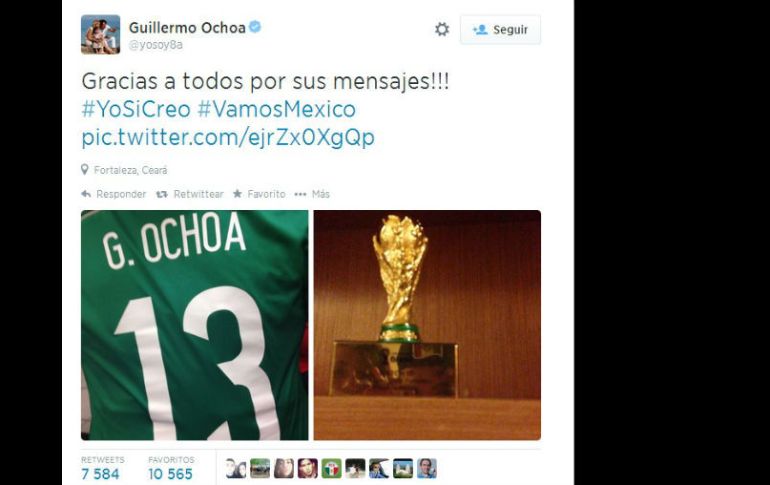 Deportes | El arquero comparte mensaje en Twitter para dar las gracias por apoyo Ochoa agradece a los aficionados El arquero comparte mensaje en Twitter para dar las gracias por apoyo Por: SUN 17 de junio de 2014 - 19:53 hs Imagen de la publicación que el guardameta publicó en Twitter. ESPECIAL / CIUDAD DE MÉXICO (17/JUN/2014).- El arquero mexicano Guillermo Ochoa agradeció en su cuenta de Twitter a los aficionados, tras los mensajes que ha recibido por su gran actuación frente a Brasil, en el Mundial de Futbol 2014. El portero de la selección tuiteó lo siguiente en su cuenta ( @yosoy8a): Gracias a todos por sus mensajes!!! #YoSiCreo #VamosMexico Temas Guillermo Ochoa Futbol Internacional Selección mexicana Twitter Mundial Brasil 2014 Lee También ¿Dónde ver EN VIVO el partido amistoso México vs Colombia? Dónde ver EN VIVO el México vs Argentina por el Mundial Sub-20 La actualidad de Diego Ochoa, formado en Chivas y destacado en el Mundial Sub-20 José Jerí asume como presidente de Perú Recibe las últimas noticias en tu e-mail Todo lo que necesitas saber para comenzar tu día Registrarse implica aceptar los Términos y Condiciones