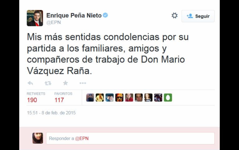 Deportes | El Mandatario manifestó sus condolencias a sus familiares a través de Twitter Peña Nieto lamenta fallecimiento de Mario Vázquez Raña El Mandatario manifestó sus condolencias a sus familiares a través de su cuenta de Twitter Por: NTX 8 de febrero de 2015 - 15:35 hs CIUDAD DE MÉXICO (08/FEB/2015).- El Presidente Enrique Peña Nieto lamentó el fallecimiento del dirigente deportivo mexicano, Mario Vázquez Raña y manifestó sus condolencias a sus familiares. A través de su cuenta oficial de Twitter, @EPN, escribió "mis más sentidas condolencias por su partida a los familiares, amigos y compañeros de trabajo de Don Mario Vázquez Raña". Asimismo en un segundo twit agregó: "don Mario, amigo y mexicano ejemplar, será recordado siempre como un incansable promotor del deporte y el periodismo". Temas Enrique Peña Nieto Odepa Mario Vázquez Raña Decesos de personalidades Lee También Fallece John Lodge, bajista de The Moody Blues Sociales: Che Eguiarte 40’s party Sociales: El Informador inicia una nueva etapa con la moderna imprenta "Doña Stella" Muere Miguel Ángel Russo, entrenador de Boca Juniors Recibe las últimas noticias en tu e-mail Todo lo que necesitas saber para comenzar tu día Registrarse implica aceptar los Términos y Condiciones