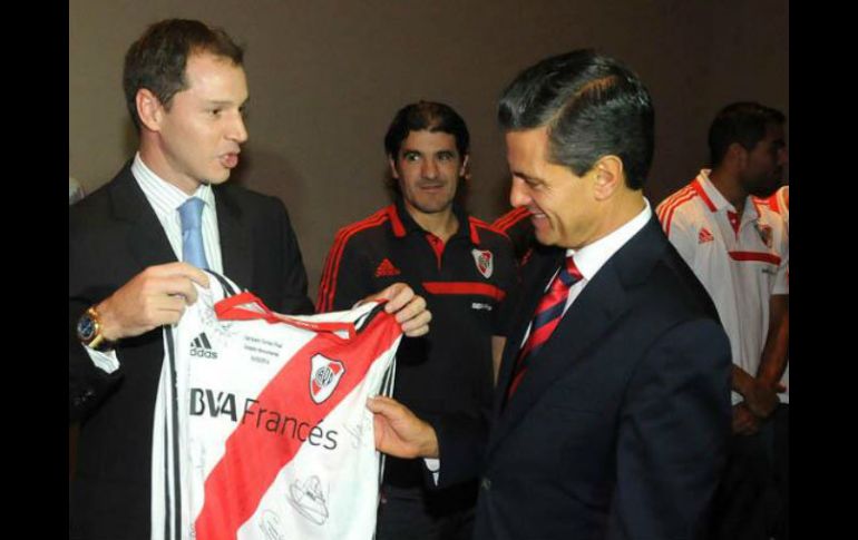 Deportes | El Presidente recibe a los jugadores que se medirán ante el Boca Juniors este sábado Peña Nieto se reúne con el River Plate El Presidente recibe a los jugadores que se medirán ante el Boca Juniors este sábado en la cancha del Azteca Por: SUN 30 de mayo de 2014 - 21:34 hs El Mandatario recibió una camiseta del club argentino. Imagen de@ca_river_plate. ESPECIAL / CIUDAD DE MÉXICO (30/MAY/2014).- El Presidente de México, Enrique Peña Nieto, tuvo una reunión con los jugadores del equipo argentino River Plate, quienes este sábado se medirán a Boca Juniors en la cancha del estadio Azteca. Jorge Brito, presidente del cuadro millonario, fue el encargado de obsequiarle al Mandatario la playera del equipo, la cual lucía en la parte de la espalda el número 35, haciendo alusión al más reciente título de liga obtenido por River Plate. Varios jugadores del equipo pampero estuvieron presentes, además del entrenador interino Gustavo Zapata, quien será reemplazado en el puesto por una de las grandes leyendas de ese club, Marcelo 'Muñeco' Gallardo. Temas Futbol Internacional Enrique Peña Nieto River Plate Boca Juniors Partidos amistosos Estadio Azteca Lee También Cartucho Muere Miguel Ángel Russo, entrenador de Boca Juniors Futbol hoy 9 de octubre de 2025: ¿Dónde ver los partidos en vivo? La Granja VIP 2025: Estos son los participantes del nuevo reality Recibe las últimas noticias en tu e-mail Todo lo que necesitas saber para comenzar tu día Registrarse implica aceptar los Términos y Condiciones