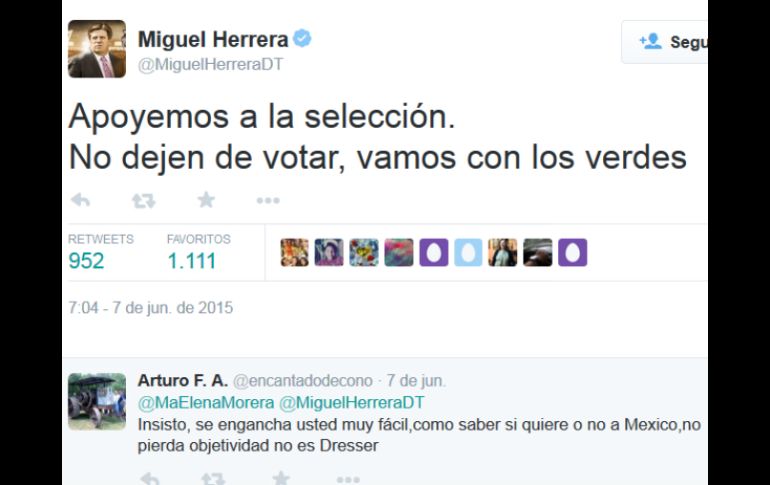 Deportes | Enrique Bonilla asegura que la FMF ya tomó cartas en el asunto 'Piojo', Marco Fabián y Peralta serían sancionados por tuit político El director general de la Liga MX, Enrique Bonilla asegura que la FMF ya tomó cartas en el asunto Por: EL INFORMADOR 8 de junio de 2015 - 15:54 hs Ayer domingo, día de jornada electoral para México, el 'Piojo' publicó un mensaje en su Twitter. TWITTER / @MiguelHerreraDT GUADALAJARA, JALISCO (08/JUN/2015).- Por el tuit que escribió el técnico de la Selección mexicana de futbol, Miguel Herrera, que decía, "Apoyemos a la selección. No dejen de votar, vamos con los verdes", la Federación Mexicana de Futbol podría darle una sanción al estratega, según expresó el director general de la Liga MX Enrique Bonilla. El tuit fue puesto el 7 de junio, día de votaciones en todo el país y en alusión de que estaba apoyando a un partido político, lo cual podría traerle castigo al "Piojo", así como a Marco Fabián, quien también siguió los pasos de su entrenador. "¡Buenos días México! ¡No dejen de ir a votar! Después, a disfrutar del partido, ¡hoy queremos ganar! #PonteDeVerde", indicó en la red social el también jugador de Chivas. Bonilla indicó que hasta hoy, no ha recibido algún comunicado por parte del INE, de cualquier manera ellos tomarán las medidas necesarias para evitar se repita esto en un futuro. "La Federación próximamente dará respuestas puntuales y algo interesante saldrá de esto. Los jugadores y el entrenador están afiliados a la Femexfut por lo que ellos son los encargados de imponer o no las sanciones correspondientes. La Federación ya tomó cartas en el asunto, yo sólo te puedo decir que en los próximos días les darán una sorpresa al respecto". Otro elemento que participó en la red social apoyando a un partido político fue el delantero Oribe Peralta, quien esto puso: "¡Arriba México! Antes que nada...¡Vámonos a votar! Después, a ver a @MiSeleccionMX ¡Quiero un #MéxicoVerde #PonteDeVerde". EL INFORMADOR / ALEJANDRO RAMÍREZ Temas Futbol Mexicano PVEM FMF Marco Fabián Miguel El Piojo Herrera Twitter Oribe Peralta Recibe las últimas noticias en tu e-mail Todo lo que necesitas saber para comenzar tu día Registrarse implica aceptar los Términos y Condiciones
