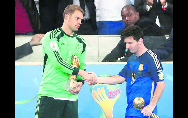 Deportes | Reacciones de los ganadores de los mejores jugadores del Mundial Polémico Balón de Oro a Messi Reacciones de los ganadores de los mejores jugadores del Mundial según los expertos de la FIFA Por: EL INFORMADOR 14 de julio de 2014 - 02:23 hs RÍO DE JANEIRO, BRASIL (14/JUL/2014).- Pese a la derrota que sufrió Argentina en la final de la Copa del Mundo Brasil 2014, el delantero Lionel Messi afirmó que se van con la frente en alto, al tiempo de asegurar que el trofeo de “Balón de Oro” es muy poco para él. “Una lástima no volver con la Copa, pero volvemos con la frente bien alta. Nos podemos ir tranquilos del Mundial. El Balón de Oro significa muy poco para mí en este momento”. Aceptó que este revés “es un dolor grande, jugábamos algo importante, el país estaba pendiente y queríamos darle esta alegría. Por ellos y por nosotros”. “En lo personal viví muchas tristezas con la Selección, ésta era la oportunidad de cambio. Sólo quería levantar la Copa y llevarla para Argentina, merecíamos más”, apuntó. El portero Manuel Neuer calificó de “magnífica” la manera en que la selección de Alemania ganó por cuarta ocasión en la historia la Copa del Mundo. “El equipo lo ha hecho magníficamente. No sólo los jugadores, sino también el equipo detrás del equipo. En algún momento vamos a dejar de celebrar, pero siempre se levantará de nuevo con una sonrisa”, expuso al final del encuentro. El guardameta, quien se llevó el “Guante de oro” como mejor en su posición, manifestó que era “increíble” que los teutones ganaran este certamen por cuarta vez en la historia. Felicitan al máximo goleador El presidente de Colombia, Juan Manuel Santos, y el delantero del Mónaco Radamel Falcao expresaron su felicitación a James Rodríguez por haber recibido la bota de oro como goleador del Mundial de Brasil 2014, en el que marcó seis anotaciones. “Felicitaciones James Rodríguez, goleador del Mundial Brasil 2014. ¡Que viva Colombia!”, reseñó el presidente Santos en su cuenta de Twitter, a la vez que destacó el premio al Juego Limpio con el que fue distinguida la selección colombiana de fútbol. Falcao felicitó a su compañero de equipo: “Felicitaciones a mi amigo James Rodríguez por ser el goleador del mundial. Felicidades y viva Colombia!!!”. La premiación Balón de Oro al Mejor Jugador: Lionel Messi (ARG). Balón de Plata: Thomas Müller (ALE). Balón de Bronce: Arjen Robben (NED). Bota de Oro al Máximo Goleador: James Rodríguez(COL). Bota de Plata: Thomas Müller (GER). Bota de Bronce: NEYMAR (BRA). Guante de Oro al Mejor Portero: Manuel Neuer (ALE). Premio al Mejor Jugador Joven (hasta 23 años): Paul POGBA (FRA). Premio al Juego Limpio: Colombia. Temas Futbol Internacional FIFA Lionel Messi Mundial Brasil 2014 Recibe las últimas noticias en tu e-mail Todo lo que necesitas saber para comenzar tu día Registrarse implica aceptar los Términos y Condiciones