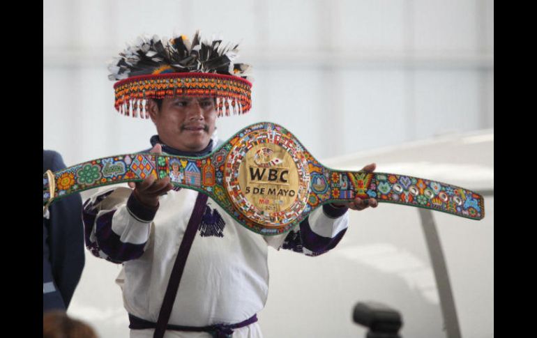 CIUDAD DE MÉXICO (24/ABR/2017).- El Consejo Mundial de Boxeo (CMB), presentó el cinturón Adolfo López Mateos que fue realizado por el artista huichol Luis de la Cruz y será entregado a los ganadores de las peleas que se celebren el fin de semana del 5 de mayo y 16 de septiembre.El fajín verde fue confeccionado con 40 mil piezas de micro chaquira de cristal y se emplearon 300 horas en su elaboración y que está inspirado en elementos de la vida ceremonial que trascienden el folclor tradicional indígena.El camino de la vida como es llamada la obra de Luis de la Cruz, es una obra donde el observador puede ver la narración de lectura múltiple, dependiendo de la dirección particular deseada.La idea del cinturón, explicó Mauricio Sulaimán, surgió de " una combinación de ideas que nos propiciamos al celebrar a México por lo que le ha dado al boxeo".Las 40 mil piezas de micro chaquira fueron engarzadas sobre el cuero del cinturón con dos técnicas: pegado de cristales uno a uno y el tejido con previo "bocetaje" en papel milimétrico.El cetro será entregado por primera vez el 6 de mayo al ganador del pleito entre Saúl "Canelo" Álvarez y Julio César Chávez Jr.Juliana Sola, nieta de Adolfo López Mateos, entregará el cinturón.