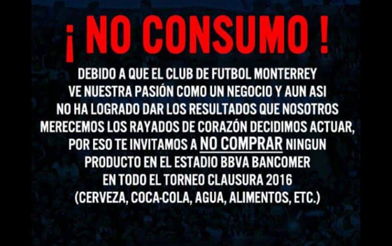 Deportes | Un sector de la afición invita a un boicot de productos en el estadio Protestan aficionados del Monterrey Un sector de la afición invita a un boicot de productos en el estadio Por: EL INFORMADOR 5 de enero de 2016 - 14:31 hs Los aficionados de Rayados buscan que el equipo rinda en la temporada. FACEBOOK / GUADALAJARA, JALISCO (05/ENE/2016).- Algunos aficionados del Monterrey se encuentran molestos por el desempeño del equipo en las últimas temporadas y para el partido del próximo sábado en el nuevo estadio de los Rayados invitaron a un boicot de productos dentro del inmueble. La invitación se hizo en el muro de facebook de "La Adicción" donde presentaron un desplegado donde muestran su inconformidad por el armado del equipo y el poco interés por la opción de los aficionados regios. El desplegado se acompaña del siguiente texto: "Después de las declaraciones de Dorlan Pabon de que juegan cuando quieren es momento de darle a los directivos haber si se amarran los huevos y meten en cintura a esos huevones que se pasean por la cancha". Los grupos de animación en Monterrey son conocidos por su fervor a los equipos locales, pero también por radicalizar de alguna manera sus molestias ante el paso de sus equipos. Temas Futbol Mexicano Rayados de Monterrey Liga MX Clausura 2016 Lee También Chivas Femenil, a una victoria de asegurar su lugar en Liguilla México busca frenar el paso perfecto de Argentina en Mundial Sub-20 Lista actualizada de selecciones que ya clasificaron al Mundial 2026 Mundial 2026 traerá derrama millonaria al país Recibe las últimas noticias en tu e-mail Todo lo que necesitas saber para comenzar tu día Registrarse implica aceptar los Términos y Condiciones