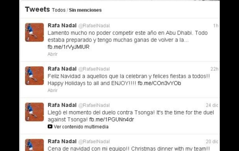 Deportes | El tenista sufre una infección estomacal Rafa Nadal aplaza su reaparición El deportista español ha tenido que aplazar su reaparición prevista para el próximo día 28 en el torneo de exhibición de Abu Dabi Por: EFE 25 de diciembre de 2012 - 08:06 hs Rafael Nadal dió a conocer a través de Twitter que no participará en el torneo de Abu Dabi. ESPECIAL / MADRID, ESPAÑA (25/DIC/2012).- Rafael Nadal ha tenido que aplazar su reaparición, prevista para el próximo día 28 en el torneo de exhibición de Abu Dabi, debido a una infección estomacal, según ha explicado el tenista español en su cuenta de twitter. "Lamento mucho no poder competir este año en Abu Dhabi. Todo estaba preparado y tengo muchas ganas de volver a la competición pero los médicos me han prohibido competir en Abu Dhabi por una infección estomacal que me ha producido fiebre", afirma Nadal. Temas Tenis Rafael Nadal Twitter Lee También No solo Puma, estas son las colecciones de tenis para Día de Muertos 2025 (FOTOS) Tlaquepaque regulará la operación de mototaxis Trump castigó a YouTube tras ganar millonaria demanda El tenis ahora es de los deportes favoritos en Guadalajara Recibe las últimas noticias en tu e-mail Todo lo que necesitas saber para comenzar tu día Registrarse implica aceptar los Términos y Condiciones