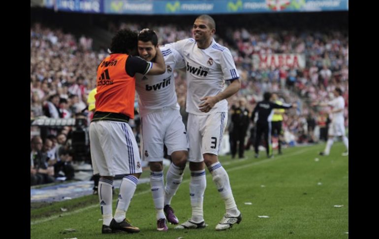 Deportes | Madrid logró vencer al Athletic 3-0 sin varios titulares, con dos goles de Kaká Real Madrid recupera esperanzas Madrid logró vencer al Athletic 3-0 sin varios titulares, con dos goles de Kaká Por: REUTERS 9 de abril de 2011 - 12:50 hs Cristiano Ronaldo celebra con sus compañeros tras marcar el tercer gol ante el Athletic Bilbao, en un partido de la Liga Española. AP / BILBAO, ESPAÑA (09/ABR/2011).- El mediocampista brasileño Kaká anotó el sábado dos goles desde el punto penal en el triunfo 3-0 del Real Madrid ante el Athletic de Bilbao, victoria que mantiene vivas las esperanzas del conjunto blanco de lograr el título de la Liga de fútbol de España. Kaká anotó a principios de cada mitad después de dos infracciones dentro del área sobre el argentino Angel Di María. Cristiano Ronaldo entró desde el banco de suplentes para sellar la victoria del equipo "merengue", con su gol número 28 de la campaña en el minuto 70. El Madrid logró el triunfo sin varios titulares. El técnico José Mourinho dio descanso a jugadores claves pensando en el partido de vuelta del miércoles por los cuartos de final de la Champions League ante el Tottenham Hotspur y en el duelo del próximo fin de semana por la Liga ante el Barcelona. El Real Madrid, segundo en la tabla, tiene 76 puntos con siete partidos por jugar, a cinco puntos del líder, el Barcelona, que enfrentaba más tarde el sábado al Almería, equipo amenazado por el descenso. Temas Futbol Español Futbol Internacional Champions League Real Madrid Lee También Organismo internacional prevé tensión comercial a nivel global en 2026 Futbol hoy 12 de octubre de 2025: ¿Dónde ver los partidos en vivo? Nos quedamos con sensaciones cortas: Eduardo Arce Hay jugadores que no estuvieron a la altura: Javier Aguirre Recibe las últimas noticias en tu e-mail Todo lo que necesitas saber para comenzar tu día Registrarse implica aceptar los Términos y Condiciones