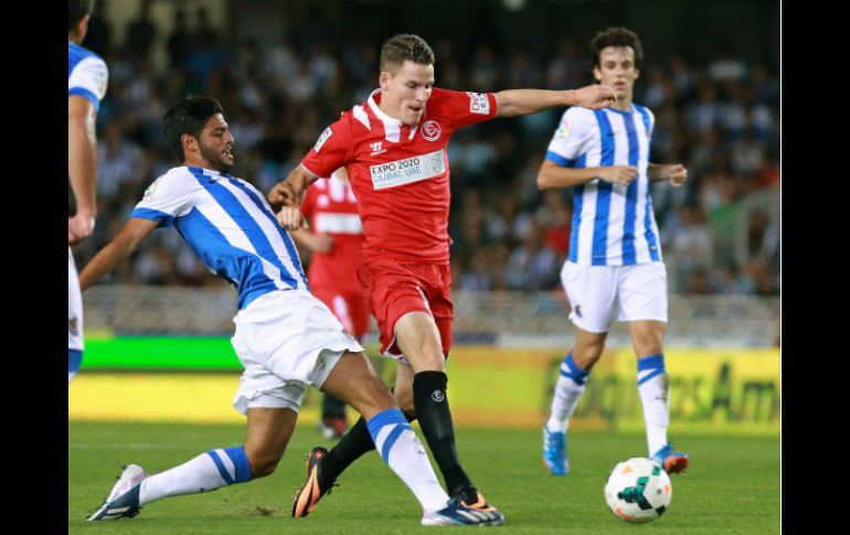 Deportes | El delantero mexicano es titular en el empate a un gol frente al Sevilla Reaparece Vela en empate de la Real Sociedad El delantero mexicano es titular en el empate a un gol frente al Sevilla Por: NTX 28 de septiembre de 2013 - 15:33 hs Carlos Vela (I) fue titular en el empate de la Real Sociedad frente al Sevilla. EFE / SAN SEBASTIÁN, ESPAÑA (28/SEP/2013).- La Real Sociedad, donde milita el delantero mexicano Carlos Vela, hilvanó este día su sexto partido sin ganar en la temporada 2013-2014 (cinco en Liga y uno en Champions) luego de empatar 1-1, frente al Sevilla. Tras un arranque de campaña prometedor, los Txuri Urdin, cayeron en un bache, que hoy se acrecentó un poco más al no poder en la cancha del estadio Anoeta frente a los Palanganas, en duelo correspondiente a la jornada siete de la Liga de España. El Sevilla se puso en ventaja 1-0, desde los 18 minutos por conducto del volante Jairo Sampeiro, quien superó con su remate al portero chileno Claudio Bravo, por lo que la Real tuvo que remar contracorriente a muy temprana hora. A los de casa les costó hacerse del balón en el primer lapso, por lo que su mejor versión del encuentro se apreció en el segundo tiempo. El técnico Jagoba Arrasate recuperó al quintanarroense Carlos Vela, quien fue titular en la Real. Y el mexicano, descartado por cansancio en el choque pasado frente al Barcelona, comenzó a crear peligro sobre la meta sevillana, su primera ocasión fue un disparo que tocó por fuera en las redes. Después Vela Garrido estuvo cerca de empatar las acciones cuando a los 56 minutos, tomó un rebote en las inmediaciones del área para lanzarse de "palomita", pero el balón se impactó en el poste para fortuna del equipo visitante. Al minuto 66, llegó el empate de la Real Sociedad, luego que Carlos Vela envió centro al área para el francés Antoine Griezmann, quien remató de cabeza, pero el portero portugués Beto atajó, aunque en una segunda oportunidad, el galo disparó para por fin colocar el 1-1. Instantes después el atacante mexicano, al 72, se encontró con un balón a modo para controlar dentro del área, pero prefirió sacar el testarazo y el esférico se fue por un costado. El Sevilla se complicó las cosas al 85, porque el defensa Juan Cala se fue expulsado por doble amarilla. El marcador ya no se movió y las fallas de la Real Sociedad en el ataque, casi cuestan caro, ya que los visitantes tuvieron peligroso acercamiento a la meta rival, comandado por el alemán Marko Marin, pero el 1-1, ya no se movió. Con la igualada la Real Sociedad sumó siete unidades en el noveno sitio, el miércoles va contra el Bayer Leverkusen en la Champions, Sevilla llegó a seis puntos. Temas Futbol Español Futbol Internacional Carlos Vela Recibe las últimas noticias en tu e-mail Todo lo que necesitas saber para comenzar tu día Registrarse implica aceptar los Términos y Condiciones