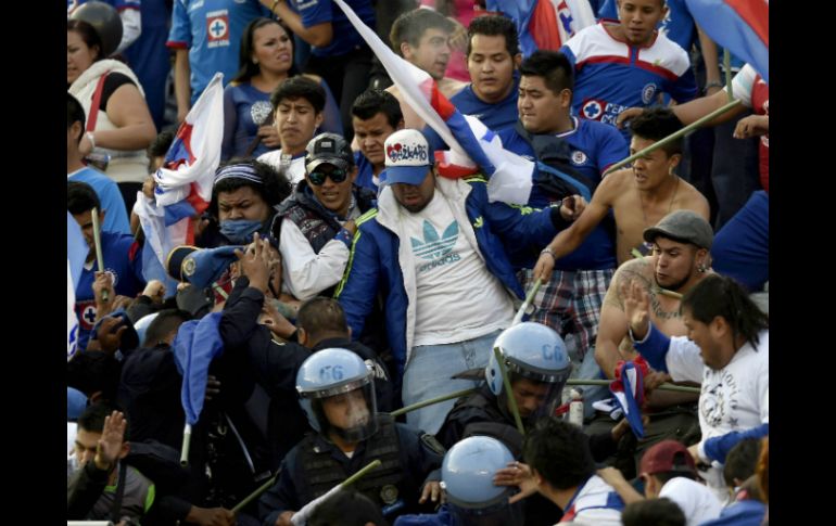 Deportes | La reyerta se desencadena durante el medio tiempo del partido entre Chivas y Cruz Azul Reportan altercado entre aficionados y granaderos en el estadio Azul La reyerta se desencadena durante el medio tiempo del partido entre Chivas y Cruz Azul Por: NTX 21 de febrero de 2015 - 19:12 hs La disputa entre los efectivos capitalinos y el grupo de animación La Sangre Azul, duró menos de diez minutos. AFP / A. Estrella CIUDAD DE MÉXICO (21/FEB/2015).- Integrantes del grupo de animación La Sangre Azul y granaderos de la Secretaría de Seguridad Pública del Distrito Federal ( SSPDF) protagonizaron un par de broncas en el interior del estadio Azul a la mitad del juego entre Cruz Azul y Guadalajara. Los jugadores de ambos clubes regresaban a la cancha para el reinicio del partido, cuando la reyerta ya estaba en su apogeo. Unos 500 uniformados se apostaron sobre los pasillos y la parte más baja de la cabecera norte en cuatro líneas, las cuales abarcaban toda la parte inferior junto al enrejado que divide la tribuna del campo de juego. Fue en la parte media de esta grada donde comenzó la bronca, primero con jalones y luego con golpes. Los policías trataban de sujetar y "encapsular" a algunos elementos de la "barra", mientras otros integrantes de ésta trataban de liberarlos, al tiempo que soltaban algunos golpes a los de azul marino. Los efectivos capitalinos se defendían y daban golpes con sus escudos y toletes, mientras los barristas usaban las varas de sus banderas, en altercado que duró aproximadamente siete u ocho minutos. Ya cuando todo pareció calmarse, volvió a prenderse la mecha cuando algunos uniformados subían las escaleras, aunque éste connato de bronca fue más breve. Temas Chivas Futbol Mexicano SSPDF Máquina del Cruz Azul Liga MX Clausura 2015 Lee También Esta es la mejor película mexicana de terror, según la Inteligencia Artificial Dónde ver EN VIVO el México vs Argentina por el Mundial Sub-20 Difícil cierre para el peso; rompe el techo de las 19 unidades por dólar ¿Quién ganará el partido entre las América y Chivas? Esto dice la IA Recibe las últimas noticias en tu e-mail Todo lo que necesitas saber para comenzar tu día Registrarse implica aceptar los Términos y Condiciones