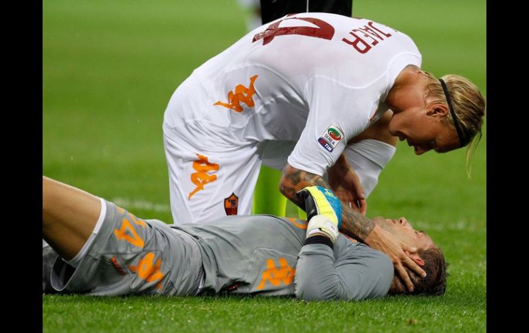 Deportes | Recibió varios puntos de sutura y descartaron cualquier tipo de hematoma Reportan con buena salud al portero del Roma El meta holandés recibió una patada en la cabeza que lo dejó por unos instantes inconsciente Por: EFE 18 de septiembre de 2011 - 08:08 hs Maarten Stekelenburg, recibió una patada del jugador brasileño Lucio del Inter de Milán, el pasado sábado. REUTERS / ROMA, ITALIA (18/SEP/2011).- El portero holandés del Roma Maarten Stekelenburg, quien tuvo que ser ingresado de urgencias a un Hospital tras recibir una patada en la cabeza, se encuentra estable y “ha pasado una noche tranquila”, así lo informó el representante del meta holandés Robert Jansen, Jansen explicó que le han tenido que dar varios puntos de sutura, pero que la Tomografía Axial Computarizada (TAC) ha dado resultado negativa y ha excluido cualquier tipo de hematoma. El representante quiso por el momento evitar polémicas sobre si la patada de Lucio fue "voluntaria o involuntaria" y afirmó que cuando Stekelenburg se haya recuperado completamente se estudiará junto con el club si se puede "hablar de la posible responsabilidad de Lucio". El meta holandés recibió la patada del brasileño en el minuto 18. Durante unos instantes llegó a perder la consciencia, por lo que fue transportado con un collarín en camilla a los vestuarios y posteriormente al hospital de Niguarda de Milán. El representante del meta explicó que los médicos aun no han informado sobre el tiempo de recuperación de Stekelenburg. Temas Futbol Internacional Inter de Milán AS Roma Lee También México vs Colombia • Momentos destacados • Partido amistoso México cae ante Argentina y termina el sueño mundialista en Chile México vs Argentina • Momentos Destacados • Cuartos de Final • Mundial Sub-20 Inauguran Festival Cervantino con mensaje para Veracruz Recibe las últimas noticias en tu e-mail Todo lo que necesitas saber para comenzar tu día Registrarse implica aceptar los Términos y Condiciones
