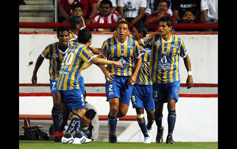 Los elementos del San Luis celebran la primera anotación del partido ante el Necaxa. MEXSPORT /