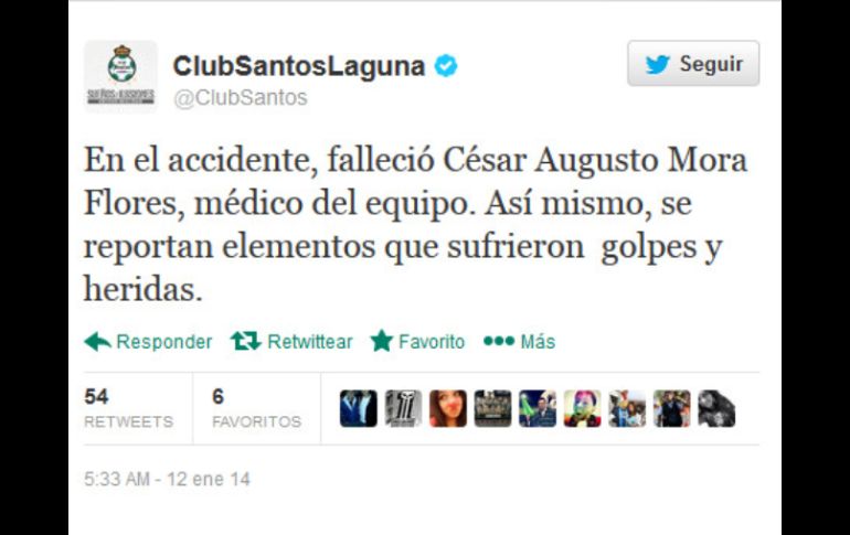 Deportes | El camión que transportaba al equipo sufre un percance la madrugada de este domingo Santos Laguna Sub 17 sufre accidente El camión que transportaba al equipo sufre un percance la madrugada de este domingo 12 de enero; el médico del equipo fallece Por: EL INFORMADOR 12 de enero de 2014 - 07:27 hs El Club Santos Laguna informa a través de su cuenta de Twitter del incidente. ESPECIAL / GUADALAJARA, JALISCO (12/ENE/2014).- A través de su cuenta de Twitter, el Club Santos Laguna informó que la madrugada de este domingo 12 de enero, el camión que transportaba al equipo en categoría Sub 17 sufrió un accidente, en donde César Augusto Mora Flores, médico del equipo murió. El percance sucedió a la altura del poblado de Cuencamé, Durango, a las tres de la mañana a su regreso a la ciudad de México luego de haber jugado contra el Cruz Azul la tarde del sábado. De los demás pasajeros se informa que ya se encuentran recibiendo atención médica en el Hospital Ángeles de Torreón pues sufrieron golpes y heridas. Luego de darse a conocer la noticia se han dado algunas reacciones apoyando a los afectados, aquí algunos tuits: "@lirarragorri: Muy triste noticia el accidente, pedimos a Dios les de fortaleza a todos nuestros sub 17 y a todo el plantel, oramos por el alma del Dr Mora". "@manuelportillaw: Tristes con la noticia de ntra Sub17 pidamos pronta recuperación a lesionados y paz y resignación a la fam del Dr Mora". "@priestra: Pedimos oraciones para para el equipo @ClubSantos Sub-17 quien sufrió un accidente donde lamentablemente perdió la vida Dr César Mora QEPD". "@miseleccionmx: Un abrazo solidario con el @ClubSantos tras el accidente de su equipo #Sub17. Estamos con ustedes #ContigoSiempre". "@jirarragorri: Mis condolencias a la familia del doctor César Augusto Mora Flores, que falleció en un accidente en el traslado la sub 17 de Santos Laguna". EL INFORMADOR / CAROLINA QUINTANILLA Temas Futbol Mexicano Accidentes deportes Santos Laguna Accidentes México Lee También Clima en Ciudad de México hoy: el pronóstico para el domingo 12 de octubre de 2025 Futbol hoy 12 de octubre de 2025: ¿Dónde ver los partidos en vivo? Nos quedamos con sensaciones cortas: Eduardo Arce Hay jugadores que no estuvieron a la altura: Javier Aguirre Recibe las últimas noticias en tu e-mail Todo lo que necesitas saber para comenzar tu día Registrarse implica aceptar los Términos y Condiciones