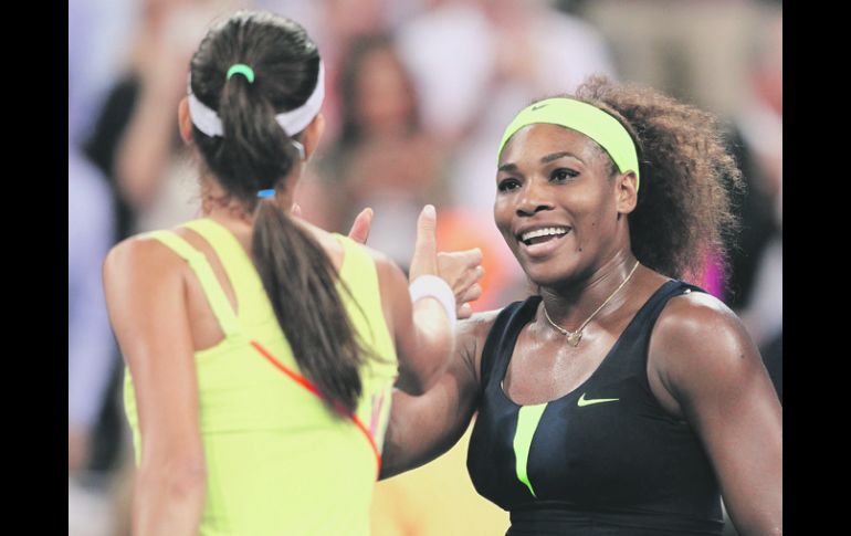 Deportes | Tenis. US Open Serena Williams lanza una advertencia Williams humilló a una rival con un doble cero, encadenó una racha de 23 juegos consecutivos ganados y lidera abrumadoramente la estadística de aces en el US Open Por: EL INFORMADOR 7 de septiembre de 2012 - 00:33 hs Adiós. Serena Williams se saluda con Ana Ivanovic, tras el encuentro que disputaron en los cuartos de final. AFP / NUEVA YORK, ESTADOS UNIDOS (07/SEP/2012).- Serena Williams humilló a una rival con un doble cero, encadenó una racha de 23 games consecutivos ganados y lidera abrumadoramente la estadística de aces en el US Open. Luego de vencer a Ana Ivanovic en cuartos de final, la estadounidense salió con esta frase: “Siento que tengo que enfocarme más, ponerme las pilas, sacar el tenis con el sello Serena”. Si tal es la intención de Williams, pues las otras tres animadoras en las semifinales del US Open no tienen nada que hacer. Williams se medirá hoy con Sara Errani, la primera italiana que alcanza la penúltima ronda del certamen desde el comienzo de la era de los torneos abiertos en 1968. La otra semifinal enfrenta a Victoria Azarenka y Maria Sharapova, quienes este año se han alternado en el primer lugar del ránking mundial. Azarenka (Australia), Sharapova (Francia) y Williams (Wimbledon) se han repartido los títulos de los tres Grand Slams que se han disputado hasta ahora. Williams es la cuarta cabeza de serie en Flushing Meadows, pero todo es decorativo. POR CIERTOFerrer gana en un maratónico duelo David Ferrer (cuarto sembrado), superó al serbio Janko Tipsarevic (8) con parciales de 6-3, 6-7 (5), 2-6, 6-3, 7-6 (4) en 4: 31 horas, para avanzar a las semifinales de la rama varonil. Temas Tenis Serena Williams US Open de Tenis Lee También Novak Djokovic avanza a semifinales del Masters de Shanghái Sabalenka mantiene su racha ganadora No solo Puma, estas son las colecciones de tenis para Día de Muertos 2025 (FOTOS) El tenis ahora es de los deportes favoritos en Guadalajara Recibe las últimas noticias en tu e-mail Todo lo que necesitas saber para comenzar tu día Registrarse implica aceptar los Términos y Condiciones