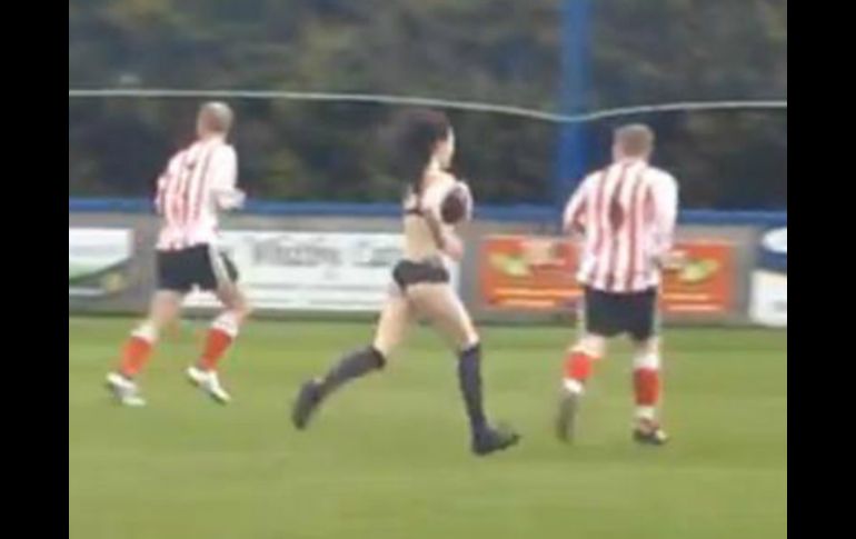 Deportes | Una joven ingresa a la cancha en ropa interior y botas durante un partido Sexy ''espontánea'' roba cámara en Inglaterra Una joven ingresa a la cancha en ropa interior y botas durante un partido Por: SUN 1 de mayo de 2013 - 10:36 hs LONDRES, INGLATERRA (01/MAY/2013).- El duelo entre Real Goth FC contra Whitby Gazette, de las divisiones inferiores de Inglaterra, habría pasado desapercibido totalmente de no haber sido por una "espontánea", que le puso sabor al juego. La joven veinteañera decidió correr por el campo en ropa interior negra y con unas botas, para ganarse los aplausos del público, así como la mirada de los futbolistas que, no obstante, continuaron con las acciones. Las cámaras captaron a la joven, quien corrió desde media cancha hasta el banderín de tiro de esquina para después irse detrás de las gradas y perderse, durante el duelo regional en el noroeste inglés. Ni los aficionados, ni el árbitro, ni los jugadores parecían estar particularmente molestos por la presencia de la espontánea, que dejó en claro que no todas las invasiones al campo deben ser desagradables. Temas Futbol Internacional Futbol Inglés Recibe las últimas noticias en tu e-mail Todo lo que necesitas saber para comenzar tu día Registrarse implica aceptar los Términos y Condiciones
