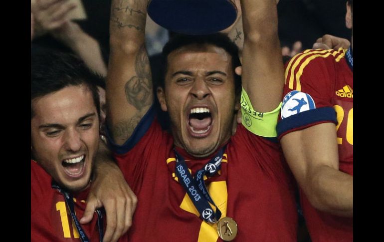 Deportes | Alcántara es el autor de un triplete en la final ante Italia Thiago, el mejor jugador del Europeo Sub-21 Alcántara es el autor de un triplete en la final ante Italia Por: EFE 21 de junio de 2013 - 12:28 hs El español es elegido de una plantilla de figuras compuesta por 23 jugadores. AP / MADRID, ESPAÑA (21/JUN/2013).- Thiago Alcántara, capitán de la selección española Sub-21 y autor de un triplete en la final ante Italia, fue declarado mejor jugador de Israel 2013 por el equipo técnico de la UEFA. Thiago fue elegido de una plantilla de figuras compuesta por 23 jugadores: 11 españoles (David de Gea, Isco Alarcón, Rodrigo Moreno, Asier Illaramendi, Koke Resurrección, Marc Bartra, Iñigo Martínes, Martín Montoyo, Alberto Moreno y Alcánta), cinco holandeses (Bruno Martins Indi, Adam Maher, Luuk de Jong y Georginio Wijnaldum), cuatro italianos (Luca Caldirola, Marco Verratti, Francesco Bardi y Fabio Borini), el ruso Alan Dzagoev y el alemán Lewis Holtby. "Como capitán de los campeones Thiago ha desarrollado sus calidades de líder dentro y fuera del campo y a lo largo del campeonato ha sido una figura clave en la actuación de su equipo", argumentó el equipo técnico de la UEFA en un comunicado. Este grupo apunta el trabajo de Thiago, su "excepcional control de balón incluso en las situaciones más complicadas, capacidad para dictar el tiempo de juego, la inteligencia para robar el balón gracias a su anticipación y su habilidad para tener una variedad en el pase corto y largo". "Sus tres goles en la final representan un éxito histórico individual y premia su contribución al éxito de su equipo", apuntó el equpo técnico conformado por Jean-François Domergue de Francia, Peter Rudbaek de Dinamarca, Dany Ryser de Suiza, Dusan Savic de Serbia, Ioan Lupescu de Rumania y Mordechai Shpigler de Israel. Temas Futbol Internacional UEFA Selección de España Lee También México busca frenar el paso perfecto de Argentina en Mundial Sub-20 Lista actualizada de selecciones que ya clasificaron al Mundial 2026 Mundial 2026 traerá derrama millonaria al país ¿Dónde ver EN VIVO el partido amistoso México vs Colombia? Recibe las últimas noticias en tu e-mail Todo lo que necesitas saber para comenzar tu día Registrarse implica aceptar los Términos y Condiciones