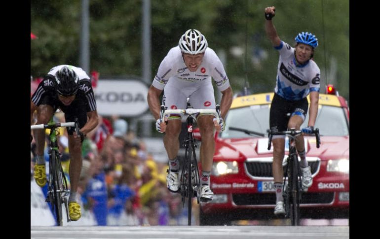 Deportes | Contador y Sánchez sorprenden a los Schleck Thor Hushovd obtiene segunda victoria Contador y Sánchez sorprenden a los Schleck Por: EFE 19 de julio de 2011 - 09:22 hs Hushovd es seguido por el noruego Edvald Boasson Hagen (izq) y el canadiense Hesjedal (der). AFP / GAP, FRANCIA (19/JUL/2011).- El noruego Thor Hushovd (Garmin) consiguió su segunda victoria en el Tour de Francia 2011, en la que el australiano Cadel Evans y los españoles Alberto Contador y Samuel Sánchez sorprendieron a los hermanos luxemburgués Franck y Andy Schleck. Un puerto de segunda categoría a diez kilómetros para el final de la decimosexta etapa, entre Saint Paul Trois Châteaux y Gap, ha dado un nuevo rumbo al Tour, en el que el francés Thomas Voeckler se mantiene líder. En el puerto de Manse, a menos de veinte para la meta, Contador atacó por dos veces. En la segunda ocasión solo le siguieron Evans y Sánchez mientras que los hermanos Schleck mostraron su debilidad al igual que el líder Voeckler. Por la cima del alto, los tres pasaron con 21 segundos de ventaja. A partir de ahí Evans tomó el mando en el descenso mientras que Voeckler hacía lo mismo en el grupo perseguidor. Lo lluvia complicó la bajada y el australiano tomó unos metros sobre el dúo español. Igual hizo el líder francés respecto a Andy Schleck. En la llegada Evans superó por tres segundos a Contador y a Sánchez, a 21 entró el grupo de Voeckler y Franck Schleck, y Andy a 1.09 del australiano. Por delante, Hushovd se impuso en el esprint a sus compañeros de fuga su compatriota Edvald Boasson Hagen y el canadiense Ryder Hesjedal, tras participar en una escapada de diez corredores que se inicio tras los cien primeros kilómetros. Temas Ciclismo UCI Tour de Francia 2011 Lee También Isaac Del Toro gana... ahora en el Gran Piemonte 2025 Isaac del Toro gana otra vez, ahora el Giro dell'Emilia 2025 ¿Actriz que donó un riñón a Selena Gomez, fue invitada a su boda? Isaac del Toro destaca en el Campeonato Mundial de Ciclismo de Ruta Recibe las últimas noticias en tu e-mail Todo lo que necesitas saber para comenzar tu día Registrarse implica aceptar los Términos y Condiciones