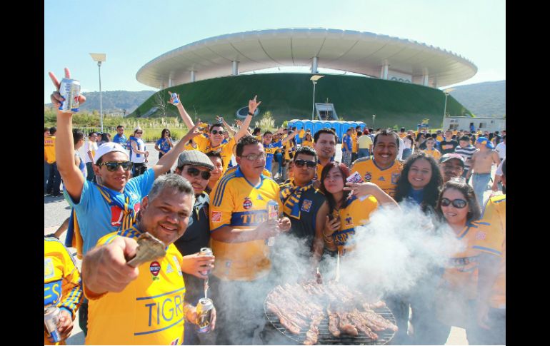 "Hicimos carne asada, venimos aquí a invadir Guadalajara desde temprano, ¡una invasión!, llegamos desde las siete de la mañana". El hombre señaló que la barra regia llegó al inmueble en 14 camiones, "trajimos 80 en cada camión, pero esa es la pura barra". En un ambiente de festejo, separados de los aficionados rojiblancos que hicieron lo propio en el área de comida, los regiomontanos convivieron de manera pacífica antes del partido."Nomás que sepan que somos el apoyo de los Tigres, en las buenas y en las malas", dijo el norteño. Asimismo, al punto de reunión de los regios acudieron también fanáticos tapatíos que apoyan a Tigres, como Alan y Omar, quienes estuvieron platicando con amigos regios que conocieron por internet. "Nos une que le vamos a los Tigres, entonces los dos venimos a conocer a algunos compas (sic) con los que platicamos en un grupo de Facebook", señaló Alan. También vinieron en avión Las jóvenes regiomontanas Perla González y Ana Laura eligieron el avión como medio de transporte para venir a apoyar a Tigres. "Venimos a apoyar a los Tigres y quisimos aprovechar para conocer el Estadio, que es lo mejor que hay a nivel nacional", explicó González. Ambas llegaron desde el sábado, en un vuelo que dicen les salió a precio justo, "la verdad todo nos ha salido súper bien, estamos bien contentas, venimos nosotras dos pero aquí nos vamos a encontrar con más amigos, aparte nos hemos encontrado con mucha gente de Monterrey, y todos hemos hecho mucha mancuerna". Lo que más les ha gustado es comer junto a las personas que comparten su misma afición, y gusto, "todo ha estado perfecto, y va a ganar Tigres". Según el presidente de Tigres, Alejandro Rodríguez, alrededor de ocho mil aficionados vinieron de Monterrey para alentar a su equipo. INFORMADOR / ILSE MARTÍNEZ