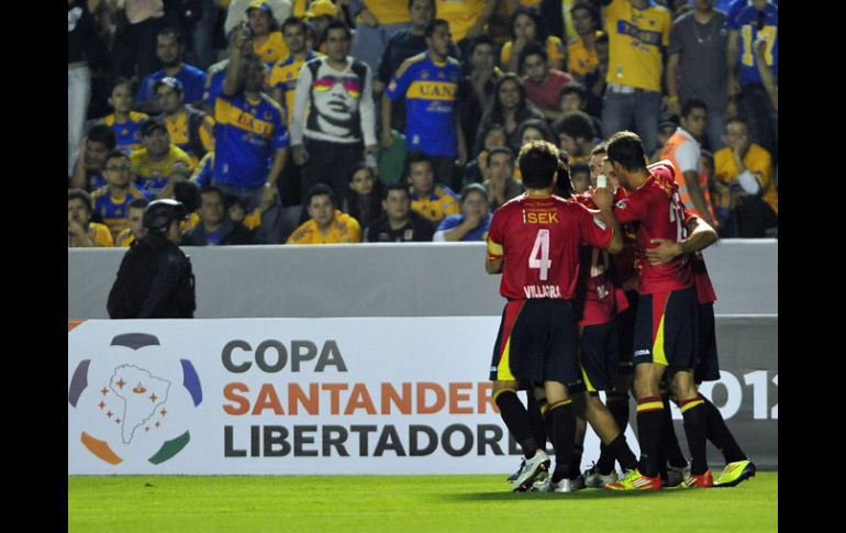 Deportes | El campeón de México es derrotado 3-2 en el global por La Unión Española de Chile Tigres, eliminado de la Copa Libertadores El campeón de México es derrotado 3-2 en el global por La Unión Española de Chile Por: AFP 2 de febrero de 2012 - 21:05 hs Los elementos de la Unión Española celebran su pase a la segunda fase de la Copa Libertadores. EFE / MONTERREY, NUEVO LEÓN (02/FEB/2012).- La Unión Española de Chile se clasificó a la fase de grupos de la Copa Libertadores, la noche del jueves, al empatar 2-2 con los Tigres de México, en partido de vuelta por la llave G6 de la primera fase jugado en el estadio Universitario de Nuevo León (norte). Alan Pulido, a los minutos 15 y 22, hizo los goles para los felinos aztecas. Emanuel Herrera, a los 38 de penal, y Sebastián Jaime, al 68, marcaron para los rojos andinos que ganaron la eliminatoria con marcador global de 3-2. Temas Copa Libertadores Futbol Internacional Tigres Lee También México vs Argentina • Momentos Destacados • Cuartos de Final • Mundial Sub-20 Inauguran Festival Cervantino con mensaje para Veracruz "Chucky" Lozano reconoce que jugaría en Chivas o en América Dónde ver EN VIVO el México vs Argentina por el Mundial Sub-20 Recibe las últimas noticias en tu e-mail Todo lo que necesitas saber para comenzar tu día Registrarse implica aceptar los Términos y Condiciones