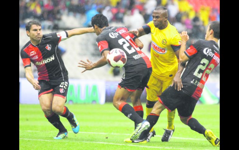 Deportes | El gol rojinegro fue obra de Hugo Rodríguez Triunfo esquivo Atlas se deja empatar en los minutos finales un partido donde tuvo para rematar al América Por: EL INFORMADOR 12 de agosto de 2012 - 01:36 hs Christian Benítez del América intenta pasar entre dos rojinegros, mientras Cufré vigila. Atlas lamentó la falta de puntería. MEXSPORT / CIUDAD DE MÉXICO (12/AGO/2012).- Atlas no supo conservar, pero sobre todo aumentar su ventaja, y América no pudo en casa. Bajo estas condiciones, el local tuvo que venir de atrás para rescatar el empate 1-1 ante los tapatíos, en partido pasado por lluvia en el segundo tiempo, correspondiente a la cuarta jornada del Torneo Apertura 2012, disputado en el Estadio Azteca ante una mala entrada motivada, en mucho, por la pertinaz lluvia que después se convirtió en tormenta y que acompañó al partido durante todo su desarrollo. Una vez más quedó claro que este América sufre ante rivales que se paran bien, que no los dejan jugar, y que aprovechan las fallas que tienen en su cuadro bajo, el cual ha dejado mucho que desear en lo que va de la campaña. Los Zorros, por su parte, se mantienen como un cuadro sólido, que se defiende bien cuando sale de visita, y que adolece de contundencia, pues tuvo para ponerse 2-0 justo antes del tanto del empate americanista; y tras el gol de Sambueza, también pudo hacer el 2-1 que le dabasu segunda victoria fuera del Estadio Jalisco. Asimismo, de no ser por el argentino Rubens Sambueza, quien colaboró con otro gran gol, este equipo habría sufrido su primer revés de la temporada y en condición de local, situación que hubiera muy mal parado al técnico Miguel Herrera. Con el resultado, los Rojinegros se mantienen invictos en el torneo con tres empates y una victoria, para sumar seis puntos; mientras que las Águilas también se mantienen sin derrota en el torneo, y con los mismo números que su visita, es decir, tres empates y una victoria, para un total de seis unidades en el campeonato. Para el olvido Pobre fue la actuación que ofrecieron ambas escuadras durante un primer lapso en el que se neutralizaron, pues aunque los de casa buscaron ir al frente, se toparon con una férrea defensiva del cuadro tapatío, que a su vez no renunció del todo al ataque, pero con sus precauciones. Uno de los pocos despistes que tuvo el Atlas se dio al minuto 29, en un pase largo para José María Cárdenas, quien por el centro controló muy bien con el pecho y cuando se disponía a definir, el ecuatoriano Christian Benítez le arrebató el esférico para cruzar demasiado su disparo y dejar escapar una oportunidad que pintaba para más en el cuadro de Coapa La respuesta de los visitantes llegó 10 minutos después en una acción en la que Sergio Santana por derecha entró al área con balón controlado y definió ante la salida de Hugo González, quien achicó muy bien para evitar la caída de su marco. Cuando parecía que se iban al descanso con la paridad, la mala marca de la zaga americanista le permitió a Hugo Rodríguez levantarse para conectar un tiro de esquina y batir la meta local para poner el 1-0, al minuto 45. Para la parte complementaria, en la que las condiciones del terreno empeoraron debido a una tromba que cayó al sur de la Ciudad de México, América buscó de manera imperativa el empate y cerca estuvo de conseguirlo por medio de José María Cárdenas, quien por izquierda pisó el área y con todo para definir cruzó demasiado su disparo. Mientras que los jaliscienses estaban en lo suyo, sin arriesgar de más, confiaban en la fortaleza de su zaga para mantener la meta en cero y encontrar una segunda anotación. Ésta estuvo cerca de llegar al minuto 63, en un tiro libre de Flavio Santos que Hugo González soltó, pero que el chileno Héctor Mancilla, de frente, la reventó en el travesaño. Esta falla fue determinante en el rumbo de las acciones, pues cuando no se veía por dónde podían lograr el tanto del empate apareció la zurda del argentino Rubens Sambueza para decretar la igualada, al minuto 74. Todo se originó en un rechace de tiro de esquina que el ex jugador de Estudiantes, de bote pronto, prendió con rencor, para ponerla pegado al poste izquierdo, ante el inútil vuelo del chileno Miguel Pinto. Con la paridad, los de casa se fueron con todo al frente en pos de darle la voltereta, y aunque Juan Carlos Medina reventó el poste en un tiro libre, ya no pudieron salir con el triunfo, que era prácticamente una obligación. ALINEACIONESAsí jugaron América.- Hugo González, Paul Aguilar (Christian Bermúdez, 73’), Érick Pimentel, Aquivaldo Mosquera, Adrián Aldrete, José Cárdenas (Antonio López, 64’), Juan Carlos Medina, Jesús Molina, Daniel Montenegro, Rubens Sambueza (Layún, 78’) y Christian Benítez. D.T. Miguel Herrera. Atlas.- Miguel Pinto, Gregorio Torres, Facundo Erpen, Leandro Cufré, Hugo Rodríguez, Luis Téllez (Luis Robles, 71’), Pablo Vigón, Lucas Ayala, Sergio Santana, Luis Sandoval (Flavio Santos, 53’) y Héctor Mancilla (Matías Vuoso, 79’). DT Juan Carlos Chávez. FRASE "Perdonamos, tuvimos para finiquitar el resultado, y a un equipo como América no le puedes dar posibilidades de despertar" Juan Carlos Chávez, director técnico del Atlas. LO QUE SIGUE En la jornada cinco el Atlas recibe a Jaguares de Chiapas, que no tiene puntos en el torneo; las Águilas visitan al Querétaro, rival directo de los Zorros en la lucha por el no descenso. REACCIONES. ECOS DE LA IGUALADA Los Zorros, con la espina de no devorar a las Águilas Técnico y jugadores del Atlas lamentaron que tuvieron en un puño al equipo de Coapa CIUDAD DE MÉXICO.- Juan Carlos Chávez se quedó con la sensación de que lejos de ganar un punto en la cancha el Estadio Azteca, había perdido dos. El timonel del Atlas fue muy claro al afirmar que tuvieron en un puño al América, y que fallas frente al arco rival le impidieron salir con la victoria. “Creo que teníamos para finiquitarlo, fa