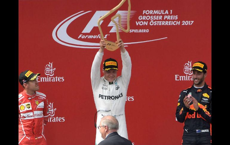 SPIELBERG, AUSTRIA (09/JUL/2017).- Valtteri Bottas tuvo un estupendo arranque desde el primer puesto y conquistó el domingo el Gran Premio de Austria, en tanto que Sebastian Vettel ocupó la segunda posición para ampliar su ventaja sobre Lewis Hamilton en el campeonato de pilotos.El finlandés Bottas hizo apenas lo suficiente para resistir el último embate de Vettel. El Ferrari del alemán llegó seis décimas de segundo detrás del Mercedes de Bottas.Daniel Ricciardo, de Red Bull, mostró una gran habilidad para evitar que le arrebatara el tercer puesto el británico Hamilton, quien estuvo a punto de rebasar al austaliano en las últimas dos vueltas pero debió conformarse con el cuarto puesto.Bottas consiguió la segunda victoria en su carrera, ambas en esta temporada, cuando llegó a Mercedes procedente de Williams. Su primer podio de por vida llegó también en la pista de Spielberg, en 2014, cuando terminó tercero corriendo por Williams.Hamilton, de Mercedes, largó desde el octavo puesto, debido a una sanción por un cambio indebido de caja de velocidades durante el Gran Premio de Azerbaiyan, realizado hace un par de semanas y conquistado por Ricciardo. El británico había obtenido el tercer mejor tiempo en la clasificación.El tapatío Sergio Pérez ocupó el séptimo sitio, uno encima del francés Esteban Ocon, su compañero en la escudería Force India.
