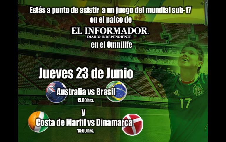 Deportes | EL INFORMADOR.COM.MX agradece tu participación ¡Ya hay nuevos ganadores de los pases para partidos del Mundial Sub 17! EL INFORMADOR.COM.MX agradece tu participación y te invita a seguir pendiente de nuestras promociones Por: EL INFORMADOR 23 de junio de 2011 - 11:13 hs La trivia se publicó el 21 y 22 de junio en la página www.informador.com.mx. ESPECIAL / GUADALAJARA, JALISCO (223/JUN/2011).- EL INFORMADOR felicita a los suscriptores que contestaron la trivia y ganaron un pase doble para disfrutar, en un palco del Estadio Omnilife, de los partidos Brasil vs. Dinamarca y Australia vs. Costa de Marfil, de la Copa del Mundo Sub-17, México 2011. A continuación la lista de ganadores: 1 JAVIER DELGADILLO PULIDO 2 CRISTOBAL GARCÍA BARÓN 3 ARTURO GUILLERMO GONZÁLEZ SALAZAR 4 JOSÉ LÓPEZ 5 MARÍA TERESA JAIME 6 PEDRO ARCE BRAVO 7 JAIME SALVADOR RAYGOZA ARANA Los ganadores fueron notificados vía correo electrónico y para recoger su acceso deberán presentarse este jueves 23 de junio en la explanada del Estadio Omnilife, a las 14:30 horas. Para recoger sus pases, es indispensable presentar una copia de identificación oficial. Temas Mundial Sub-17 México 2011 Lee También Vinculan a proceso al joven acusado de homicidio en el CCH Sur Actividades GRATIS en CDMX para celebrar Halloween y Día de Muertos Vecinos de Poza Rica alzan la voz sobre el desastre por lluvias Ticketmaster tiene todos estos conciertos al 2x1 en Ciudad de México Recibe las últimas noticias en tu e-mail Todo lo que necesitas saber para comenzar tu día Registrarse implica aceptar los Términos y Condiciones