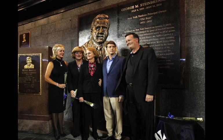 Deportes | Falleció el 13 de julio de 2010 Yankees develan monumento a Steinbrenner George Steinbrenner quedó inmortalizado el lunes con un gran monumento en el Yankee Stadium Por: AP 20 de septiembre de 2010 - 19:33 hs Miembros de la famila de George Steinbrenner' posan ante la estatua del ex dueño de los Yankees. REUTERS / NUEVA YORK. N.Y. (20/SEP/2010).- George Steinbrenner quedó inmortalizado el lunes con un gran monumento en el Yankee Stadium, que eclipsa las estatuas en honor de Babe Ruth, Lou Gehrig, Joe DiMaggio y Mickey Mantle. El monumento al dueño de los Yankees de Nueva York, quien falleció el 13 de julio, fue develado por su familia en el Monument Park del estadio, antes del juego del lunes por la noche, contra Tampa Bay, ``Fue un verdadero visionario, quien cambió para siempre el béisbol'', señala un texto en el monumento. El ex manager de los Yankeess, Joe Torre, y el ex capitán Don Mattingly, acudieron al nuevo estadio por primera vez para la ceremonia, y todo el equipo se les unió en el bullpen, junto con leyendas que están ya en el retiro, como Yogi Berra y Reggie Jackson. El comisionado de las Grandes Ligas, Bud Selig, acompañó a la viuda de Steinbrenner en la develación del monumento, detrás de la cerca del jardín central. Temas Beisbol MLB Yankees de Nueva York Recibe las últimas noticias en tu e-mail Todo lo que necesitas saber para comenzar tu día Registrarse implica aceptar los Términos y Condiciones