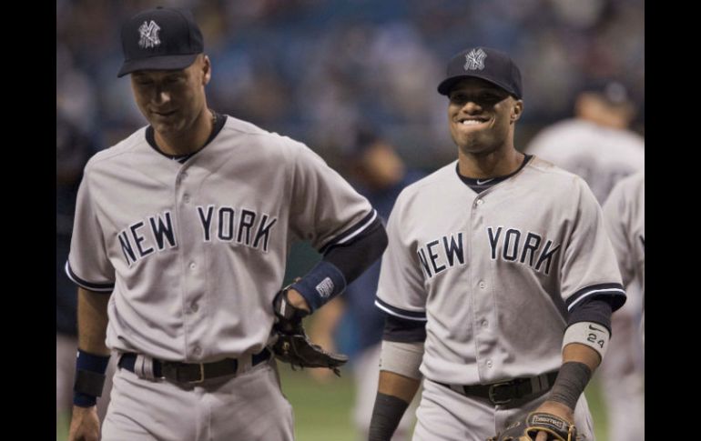 Deportes | Canó decidió con hit de dos carreras impulsadas en la octava entrada ante los Rays Yankees terminan con mala racha en el Tropicana Field Canó decidió con hit de dos carreras impulsadas en la octava entrada ante los Rays Por: EFE 4 de julio de 2012 - 19:13 hs Derek Jeter y Robinson Canó sonríen tras romper maldición contra Tampa Bay. REUTERS / TAMPA BAY, ESTADOS UNIDOS (04/JUL/2012).- El segunda base dominicano Robinson Canó volvió a poner el bate oportuno y productivo para que los Yankees de Nueva York viniesen de atrás y venciesen 4-3 a los Rays de Tampa Bay. Canó pegó sencillo impulsador de dos carreras en el racimo de tres que consiguieron los Yankees en la parte alta del octavo episodio. El toletero dominicano mantuvo su gran momento ofensivo al conseguir impulsar al menos una carrera en ocho partidos consecutivos, su mejor marca como profesional. La excelente producción de Canó permitió a los Yankees romper racha de nueve partidos consecutivos perdidos contra los Rays, en el duelo de equipos de la División Este de la Liga Americana. El tercera base Alex Rodríguez redujo la desventaja a 2-3 al comienzo del octavo episodio al anotar desde la antesala después que el relevista Kyle Farnworth (0-1) con las almohadillas ocupadas dio base por bolas. Jake McGee le quitó la pelota a Farnworth y tampoco pudo hacer su trabajo al permitir el imparable decisivo de Canó que puso a los Yankees con la ventaja parcial de 4-3, que luego sería la definitiva. Farnsworth hizo su segunda salida en lo que va de temporada después que tuvo que estar en la lista de lesionados al sufrir una torcedura en el codo derecho. La victoria fue para el relevista Boone Logan (3-0), que lanzó el séptimo episodio y aunque permitió dos imparables, incluido jonrón de dos carreras del primera base dominicano Carlos Peña (13), y dio dos bases por bolas, sin ponches, el bateo oportuno de Canó le hizo posible quedarse con la decisión. Logan le dejó la pelota al relevista David Robertson que trabajó sin anotación en octavo episodio para que en el noveno saliese el dominicano Rafael Soriano, exlanzador de los Rays, que lanzó perfecto el noveno con un ponche. Soriano logró sacar los tres últimos "outs" y logró el decimonoveno salvamento de la temporada en 20 oportunidades. El primera base Mark Teixeira (14) fue el que abrió el marcador para los Yankees en el séptimo episodio con jonrón solitario, el decimocuarto que pega en lo que va de temporada. El abridor David Price, que trataba de ser el primer lanzador de la Liga Americana en conseguir 12 triunfos, no pudo conseguirlo ante la poca eficacia que tuvo el bullpen de los Rays, que ganaron 2-1 la serie de tres partidos. Temas Beisbol MLB Yankees de Nueva York Lee También ¿Dónde ver EN VIVO la Serie Mundial Dodgers vs Blue Jays? Charros gana un juego lleno de drama, apagones y lluvia en Mexicali Charros apadrinan a 35 academias deportivas en Jalisco México vuelve a tener presencia en la Serie Mundial con un nuevo representante Recibe las últimas noticias en tu e-mail Todo lo que necesitas saber para comenzar tu día Registrarse implica aceptar los Términos y Condiciones