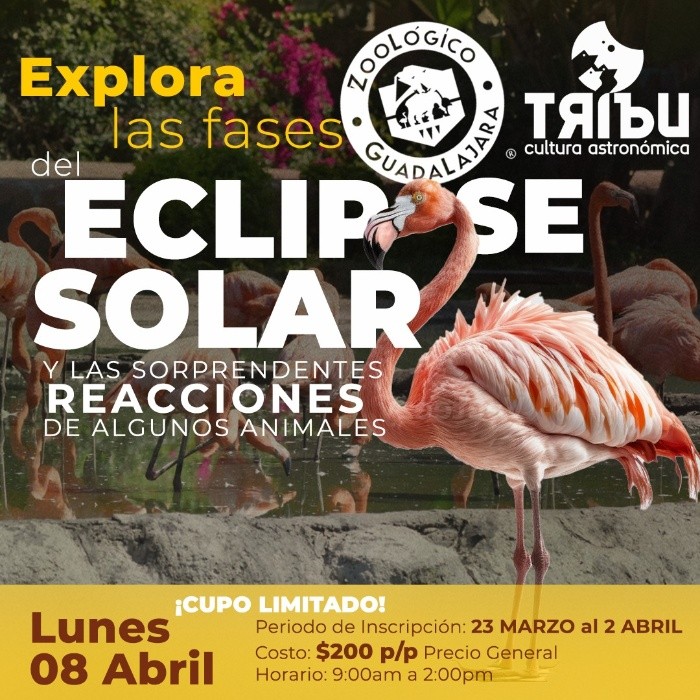 Jalisco | Actividades imperdibles que habrá en Guadalajara para disfrutar del eclipse ¿No sabes qué hacer durante el eclipse solar del próximo lunes? Checa las siguientes actividades que habrá en la ciudad El Informador 4 de abril de 2024 - 12:58 hs 1 Zoológico de Guadalajara El Zoológico Guadalajara tendrá actividades especiales durante el lunes 8 de abril, enfocadas en toda la familia, con un costo de 200 pesos. Habrá especialistas que guiarán a los visitantes a través de las fases del eclipse, además de que se observará cómo el fenómeno influye en los animales y su comportamiento. 2 Instituto de Astronomía y Meteorología (IAM) En el Instituto de Astronomía y Meteorología (IAM) las actividades iniciarán a las 10:00 horas y la entrada será por avenida Vallarta. En el instituto se llevarán a cabo observaciones en los jardines, con telescopios adaptados, proyectores y transmisión de la señal del eclipse total. 3 Planetario Lunaria El planetario Luanaria, a partir de las 10 de la mañana, tendrá actividades para toda la familia, e invitan a los tapatíos al picnic bajo el eclipse. Habrá además el siguiente itinerario: 10:00 / Arma tu caja para ver el eclipse 10:50 / Observación con telescopios 10:50 / Observación con gafas solares 10:50 / Observación indirecta 11:30 / Mitos y leyendas / Cuentacuentos 4 Centro Universitario de Ciencias Exactas e Ingenierías (CUCEI) En el caso del CUCEI, el punto de observación del eclipse será en la explanada del Módulo Y, con los tres métodos seguros de observación desde las 10:00 horas, además de que en el auditorio del Módulo Z se realizará la proyección vía streaming.