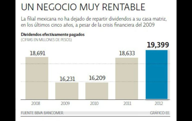 Economía | Incremento anual de 19.6% en dividendos en el 2012 Bancomer dio $19,399 millones a su matriz La filial mexicana aportó 30% del total de las ganancias obtenidas por el grupo a escala global durante el año Por: EL INFORMADOR 6 de febrero de 2013 - 23:08 hs La filial mexicana no ha dejado de repartir dividendos a su casa matriz en los últimos cinco años. EE / CIUDAD DE MÉXICO (07&/FEB/2013).- BBVA Bancomer repartió 19,399 millones de pesos en dividendos a su controladora en el 2012, lo que significó un incremento de 19.6% comparado con los 16,209 millones de pesos alcanzados en el 2011. Estos dividendos fueron efectivamente pagados, lo que comparados con los 18,633 millones de pesos pagados en el 2011, debido a los ajustes de ejercicios anteriores, significaron un aumento de 4.1 por ciento. La filial mexicana de BBVA reportó una utilidad neta de 28,123 millones de pesos en el 2012, un alza de 1.5% anual, lo que la coloca como la principal aportadora de ganancias a su matriz a escala global, con 30% del total del grupo. “México es un negocio muy importante para el grupo, donde existe un buen nivel de rentabilidad, por ello seguiremos invirtiendo en él y buscando tener más y mejores servicios en nuestra filial”, aseguró Ángel Cano, consejero delegado de BBVA. La repartición de dividendos en el 2012 representó 68.9% de las utilidades netas alcanzadas en el mismo lapso, lo que es congruente con su política de dividendos, donde los últimos cinco años ha promediado un reparto de dividendos de 50% de las utilidades totales. Crecimiento constante Para los accionistas que no son parte de la controladora, BBVA Bancomer repartió dividendos en efectivo por 696 millones de pesos, provenientes principalmente de la unidad de Seguros BBVA Bancomer, con lo que, sumado a los 19,399 millones de pesos repartidos a la casa matriz, el grupo dio dividendos por un total de 20,095 millones de pesos. Para el grupo, si bien el crecimiento de las utilidades en el 2012 fue bajo, sólo 1.5%, esto se debió a los gastos e inversiones que está llevando a cabo en los últimos tres años, ya que la rentabilidad de BBVA Bancomer es positiva. La eficiencia operativa de la filial mexicana de BBVA fue de 42.1% al cierre del 2012, un punto porcentual arriba de lo registrado un año antes, lo que permitió que la rentabilidad de los activos (ROA) fuera de 2.1% y del capital (ROE) de 20.1 por ciento. Javier Malagón, director de finanzas del grupo BBVA Bancomer comentó: “El grupo financiero es uno de los más eficientes del sector en México, si bien no es muy grande el crecimiento, sí es uno de los más constantes, donde hemos sido muy rentables en los últimos cinco años, aun en medio de la crisis financiera”. El grupo realizó pagos por la adquisición de inmuebles, mobiliario y equipo por 3,048 millones de pesos, lo que sumado a otras actividades de inversión llevó a BBVA Bancomer a realizar una salida de efectivo por actividades de inversión por 3,306 millones de pesos en el 2012. De acuerdo con la dirección del banco, no todas las utilidades se repartían al grupo, ya que están en un proceso de inversión en México, el cual está desarrollándose desde los últimos tres años. LAS CIFRAS Alcanzó 28,123 millones de pesos, la utilidad neta de la filial mexicana del grupo financiero en el 2012, un alza de 15% anual. fue de 42.1% la eficiencia operativa de la filial mexicana del grupo al cierre del 2012, un punto porcentual arriba de lo registrado en el 2011 Temas Bancos BBVA Bancomer Una selección de El Economista Lee También Enner Valencia destaca el valor del duelo ante México ¿Dónde ver EN VIVO el partido amistoso México vs Ecuador? Beccacece destaca el reto ante México en el Estadio AKRON Peso abre semana dando porrazo al dólar Recibe las últimas noticias en tu e-mail Todo lo que necesitas saber para comenzar tu día Registrarse implica aceptar los Términos y Condiciones
