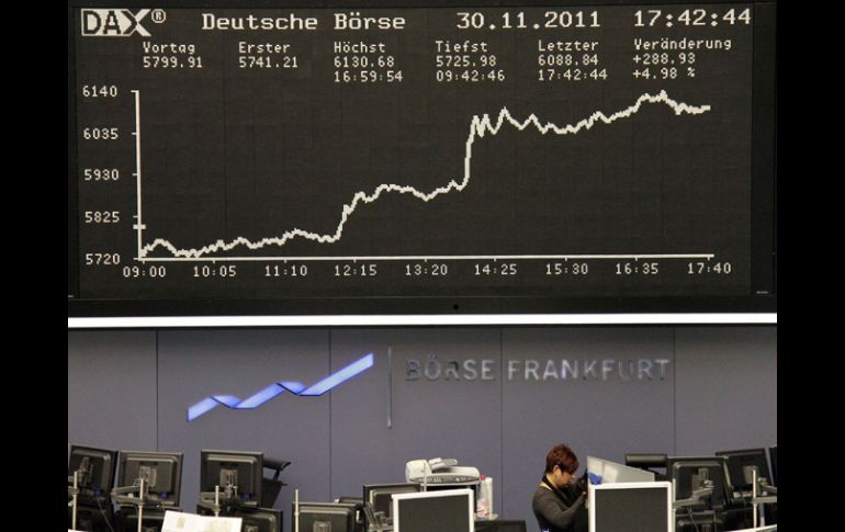 Economía | El DAX, principal índice de la Bolsa de Fráncfort, lideró las subidas Bolsas europeas suben con fuerza tras decisión de bancos centrales Decisión de los bancos centrales de adoptar medidas concertadas para la liquidez de lo bancos motivo las alzas Por: AFP 30 de noviembre de 2011 - 11:09 hs El DAX, principal índice de la Bolsa de Fráncfort, lideró las subidas con un avance del 4.98%. REUTERS / FRÁNCFORT, ALEMANIA (30/NOV/2011).- Las principales Bolsas europeas cerraron el miércoles con fuertes subidas tras la decisión de los bancos centrales de adoptar medidas concertadas para proporcionar más fácilmente liquidez a los bancos, y de China de flexibilizar el mercado de crédito, así como por los buenos resultados del mercado de empleo en Estados Unidos. El DAX, principal índice de la Bolsa de Fráncfort, lideró las subidas con un avance del 4.98%, a 6,088.84 puntos, su nivel más alto en un mes. En Milán, el FTS MIB se adjudicó la segunda mayor subida de los parqués europeos, un 4.38% a 15,268 puntos, con los valores bancarios como principales motores del alza. Banca Popolare de Emilia Romagna rebotó 12.53%, Mediobanca 7.69% y Banco Popolare 7.56%. En la Bolsa de París, el CAC 40, subió 4.22% tras un inicio de sesión difícil, para terminar en 3,154.62 puntos. El IBEX 35 de la Bolsa de Madrid subió por su parte 3.96% a 8,449.5 puntos. El índice Footsie-100 de los principales valores de la Bolsa de Londres, ganó 168.42 puntos, un 3.16%, con relación al cierre del martes, a 5,505.42 puntos, gracias a la subida de los valores bancarios y mineros, principalmente. La Bolsa de Atenas también subió 3.13% a 682.21 puntos, en la estela de la euforia generalizada por la decisión concertada de los bancos centrales. Esta medida habría provocado "una reacción más moderada en otro contexto, pero el efecto sorpresa, y sobre todo, las fuertes caídas anteriores han acentuado su impacto", estimó Daniel Pingarrón, analista de la agencia de corretaje IG Markets. Temas Bolsas de Valores Indicadores Crisis Lee También El oro y la plata alcanzan precios históricos Bolsa Mexicana gana y suma su tercera alza en la semana Bolsa Mexicana recupera terreno en una jornada de resultados mixtos a nivel mundial Bolsa Mexicana pierde y registra bajas en tres de las últimas cuatro sesiones Recibe las últimas noticias en tu e-mail Todo lo que necesitas saber para comenzar tu día Registrarse implica aceptar los Términos y Condiciones