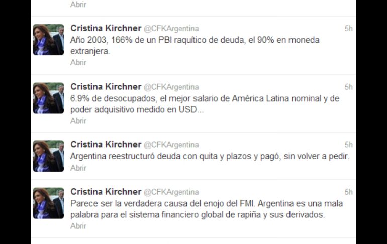 Economía | En 2006, Argentina saldó su deuda total con el FMI por nueve mil 500 millones de dólare Desendeudamiento argentino causa enojo al FMI: Kirchner En 2006, Argentina saldó su deuda total con el FMI por nueve mil 500 millones de dólares Por: AFP 2 de febrero de 2013 - 19:11 hs Kirchner publicó su opinión en torno al FMI a través de su cuenta en Twitter. TOMADA DE @CFKArgentina / BUENOS AIRES, ARGENTINA (02/FEB/2013).- La presidenta de Argentina, Cristina Kirchner, afirmó este sábado que la política de desendeudamiento de su gobierno parece ser "la verdadera causa del enojo del FMI", al aludir al voto de censura del organismo por las estadísticas del país. El desendeudamiento "parece ser la verdadera causa del enojo del FMI. Argentina es una mala palabra para el sistema financiero global de rapiña y sus derivados", señaló Kirchner en su cuenta de Twitter. "Argentina, que construyó mercado interno con inclusión social y políticas contracíclicas, le pagó al FMI y reestructuró dos veces, en 2005 y 2010, su deuda defaulteada con 93 por ciento de acuerdo de acreedores sin volver a pedir prestado al mercado financiero internacional, para terminar con la lógica del endeudamiento externo", añadió. En 2006, Argentina saldó su deuda total con el Fondo Monetario Internacional (FMI) por nueve mil 500 millones de dólares, mientras que en 2005 y 2010 reestructuró casi 93 por ciento de su deuda que había caido en default en 2001 por cien mil millones de dólares. El directorio del Fondo emitió el viernes contra Argentina una declaración de censura, la primera en la historia del organismo, por sus estadísticas oficiales. Kirchner destacó en otro tuit que, tanto el FMI como los Fondos Buitres Internacionales ("FBI") están "contra Argentina". Luego de expresar que "la 1ª medida que toma el FMI es contra Argentina", también se preguntó si "se conoce alguna sanción del FMI, alguna decisión sobre quienes se enriquecieron y fundieron el mundo?". "Dónde estaba el FMI que no pudo advertir ninguna crisis? Dónde cuando se formaron, no ya burbujas, sino globos aerostáticos financieros?", cuestionó la jefa de Estado. En otro tuit, preguntó: "qué pasa con los países emergentes que sostuvimos la economía global la última década y hoy quieren hacernos cargo de platos rotos x otros?". Temas Economía Internacional Argentina Cristina Fernández FMI Lee También La licencia de Fernández Noroña Palabras de Trump, “groseras e ignorantes con Colombia”: Gustavo Petro Futbol hoy 21 de octubre de 2025: ¿Dónde ver los partidos en vivo? Santiago Fernández se lanza contra Christian Martinoli Recibe las últimas noticias en tu e-mail Todo lo que necesitas saber para comenzar tu día Registrarse implica aceptar los Términos y Condiciones