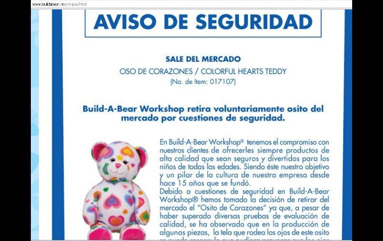 Economía | Se trata del 'Oso de corazones' el cual podría provocar ahogamientos Empresa retira osos de peluche por riesgos para niños En México se comercializaron mil 416 unidades, de las cuales los consumidores adquirieron mil 387, en tanto que la empresa retiró de tiendas 29 Osos de Corazones una vez que detectó el riesgo Por: NTX 29 de diciembre de 2011 - 17:29 hs Los usuarios que hayan adquirido el peluche podrán acercarse a la tienda y tomar otro tipo de oso sin ningún costo. ESPECIAL / CIUDAD DE MÉXICO (29/DIC/2011).- La empresa Build-A-Bear Workshop inició el retiro voluntario del 'Oso de corazones' (colorful hearts teddy), por ser un artículo riesgoso para la seguridad de los niños, informó Procuraduría Federal del Consumidor (Profeco). En un comunicado la dependencia señaló que a pesar de que la empresa superó diversas pruebas de evaluación de calidad, observó que bajo determinadas condiciones pudiera presentarse alguna contingencia. Explicó que en la producción de algunas piezas, la tela que rodea los ojos del oso se puede rasgar, eventualmente los ojos se aflojarían y caerían, lo que implica el riesgo de que un niño los ingiera, provocando un ahogamiento. En México se comercializaron mil 416 unidades, de las cuales los consumidores adquirieron mil 387, en tanto que la empresa retiró de tiendas 29 Osos de Corazones una vez que detectó el riesgo. Con ello Build-A-Bear Workshop reitera su compromiso hacia sus clientes, por lo que ofrece tres opciones de sustitución del producto al momento de devolver el mismo. La Profeco indicó que el consumidor podrá escoger cualquier amigo peluche disponible en la tienda, sin costo alguno, independientemente de su precio, aunque sin accesorios, en caso de haber adquirido un Oso de Corazones con sonido se le retirará y se le pondrá al nuevo amigo peluche. También se otorgarán 400 'osólares' en un certificado de regalo para que, posteriormente, realice el cambio de ellos en las tiendas, o se le reembolsará el dinero en efectivo en tienda, más la compensación correspondiente, de acuerdo con lo establecido en el artículo 94 de la Ley Federal de Protección al Consumidor. Build-A-Bear Workshop informó que no es necesario presentar el ticket de compra al realizar la devolución. Para el caso de aquellos consumidores que adquirieron un Oso de Corazones y no vivir cerca de una ciudad donde se encuentre una tienda Build-A-Bear Workshop, se les recomienda comunicarse a sus oficinas para mayor información para el trámite de devolución. La Profeco indicó que para mayor información el consumidor puede comunicarse al teléfono 44448888 en el Distrito Federal y Area Metropolitana o por cobrar desde el interior de la República. Temas Empresas Profeco Lee También Octubre Rosa: ¿Cuánto cuesta una mastografía en Jalisco según Profeco? ¿Cuál es el mejor horario para cargar gasolina según Profeco? Sociales: Nice de México celebra su 29 aniversario Adiós a il Piacere Recibe las últimas noticias en tu e-mail Todo lo que necesitas saber para comenzar tu día Registrarse implica aceptar los Términos y Condiciones