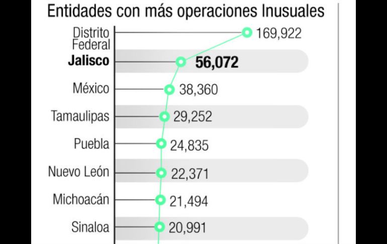 Economía | La UIF ha detectado más de 56 mil movimientos inusuales Identifican operaciones de lavado de dinero en Jalisco La UIF ha detectado más de 56 mil movimientos que podrían tener relación con el blanqueo de fondos ilícitos Por: EL INFORMADOR 7 de diciembre de 2013 - 01:35 hs Jalisco es el segundo Estado con más transacciones inusuales detectadas entre 2007 y 2013. / GUADALAJARA, JALISCO (07/DIC/2013).- Los indicadores que elabora la Unidad de Inteligencia Financiera (UIF) de la Secretaría de Hacienda y Crédito Público (SHCP), para medir la vulnerabilidad de las entidades federativas en materia de lavado de dinero, ubican a Jalisco como uno de los territorios más importantes para el blanqueo de fondos ilícitos en el país. La UIF está monitoreando permanentemente tres tipos de operaciones financieras: las inusuales, realizadas por los clientes de las instituciones del sector, bancos principalmente, que prenden la alerta de la autoridad cuando rastrea que los recursos pueden estar siendo procesados para ocultar su origen ilegal, o para costear actos ilícitos y terrorismo. Jalisco es el segundo Estado con más operaciones inusuales detectadas por la UIF en el periodo 2007-2013, con 56 mil 072, sólo después del Distrito Federal (169 mil 922). En este apartado también se consideran los comportamientos transaccionales de usuarios que repentinamente se salen por completo de su patrón habitual, ya sea que varíen el monto o la frecuencia de sus movimientos financieros, o que resulten extraños a sus actividades económicas declaradas. Luego están las operaciones preocupantes, éstas ya no involucran al cliente, sino a los directivos, funcionarios, empleados y apoderados de las instituciones financieras, cuando estos realizan acciones que pudieran contravenir o vulnerar las normas para prevenir y combatir el blanqueo. Jalisco es el séptimo Estado con más de estas conductas con 58, lo superan el Distrito Federal, Sinaloa, Chihuahua, Sonora, Nuevo León y Quintana Roo. Y finalmente, las operaciones relevantes, éstas son todas aquellas que se realizan en efectivo, con billetes y monedas de este país u otro, aun siendo de platino, oro y plata, y cheques de viajero, siempre que se trate de montos iguales o superiores a 10 mil dólares. En este caso, Jalisco vuelve a ser el segundo Estado con más de éstas, con dos millones 509 mil 186. Cuando la UIF halla los indicios suficientes de que las instituciones financieras están siendo utilizadas para el blanqueo, está obligada a denunciar los hechos ante la Procuraduría General de la República; en el periodo de 2007 a 2012 lo hizo en 232 ocasiones a nivel nacional por transacciones que ascendían a 109 mil 254 millones 173 mil 391 pesos (más que el presupuesto de los tres poderes públicos locales) y por la complejidad del delito, la unidad se dice imposibilitada para desagregar tal monto por Estado. A septiembre de 2013, la Unidad de Inteligencia Financiera presentó otras 61 denuncias penales. Según lo informó la SHCP en octubre de 2012, se estima que en el país cada año se lavan alrededor de 10 mil millones de dólares, cerca de 3.6% del Producto Interno Bruto (PIB) del país (en Estados Unidos el blanqueo es de 1.36% de su PIB). Detenciones por lavado> El sexenio de Felipe Calderón terminó con 689 detenidos por lavado de dinero y obtuvo otras 212 órdenes de aprehensión. Ejerció acción penal contra 884 pero logró sólo 83 sentencias condenatorias. > La actual administración federal ejerció acción penal contra 77 personas de enero a junio de 2013, pero sólo nueve sentencias condenatorias. • MOVIMIENTOS ''ILÍCITOS'' Por año, nueve mil transacciones Cada año se detectan en Jalisco alrededor de nueve mil operaciones inusuales (ocho mil 884) realizadas por usuarios de instituciones financieras, en las que las autoridades federales detectan la probabilidad de que se trate de lavado de dinero, mas una decena en la que se sospecha la participación de personal de las mismas entidades bancarias en acciones con ese fin ilegal. A nivel nacional el promedio anual de las operaciones inusuales es de 92 mil 550 y el de las segundas 382, de acuerdo a registros de la Unidad de Inteligencia Financiera (UIF), una institución de carácter preventivo, que elabora trabaja en la prevención y combate del lavado en México. La ubicación de Jalisco como el segundo Estado con más operaciones inusuales, y séptimo en preocupantes, según la UIF, tiene entre sus antecedentes a los reportes que se generaron durante el gobierno del ex presidente Vicente Fox (2000-2006), que ya advertían a su territorio como un centro importante para el blanqueo de recursos de origen ilícito, esto lo apunta el académico de la Universidad de Guadalajara, Emiliano Sandoval Delgado, especializado en las Ciencias Forenses y Criminología, y autor del libro “El Delito de Blanqueo de Bienes en el Código Penal Federal, desde una Perspectiva Criminológica y Preventiva”. De 2007-2012 (a su primer semestre), Jalisco fue ubicado como el quinto Estado con la mayor incidencia delictiva de lavado de dinero, según la Procuraduría General de la República, con 57 casos registrados . En ese lapso indagó en el país dos mil 326 operaciones con recursos de procedencia ilícita, de éstas, mil 301 no están categorizadas por Estado, pero mil 025 sí, y éstas fueron encabezadas por los estados de Sinaloa, 357; Sonora, 120; Baja California Sur, 99 y Tamaulipas, 63. • Movimientos inusuales La UIF detectó 579 mil 366 operaciones inusuales en el sistema financiero mexicano de 2007 a 2013 (primer trimestre), una de cada 10 en Jalisco (56 mil 072). El 31 de octubre pasado la OFAC señaló a 20 empresas asentadas en Guadalajara ligadas con Caro Quintero, y operando el ramo inmobiliario, gasolinero, agrícola, entre otros. Aquel día, Adam Szubin, director de la Oficina de Control de Bienes de Extranjeros (OFAC, en inglés) de Estados Unidos, dijo: “La d