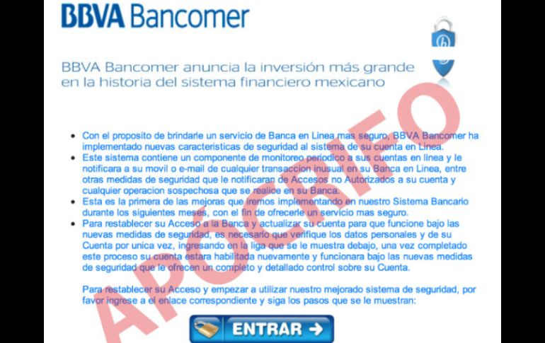 Economía | El correo busca ''implementar'' nuevas características de seguridad La Condusef alerta sobre correo fraudulento de BBVA Detallan que el correo busca ''implementar'' nuevas características de seguridad Por: NTX 10 de julio de 2013 - 18:38 hs La Condusef difunde el correo apócrifo por medio de su cuenta en Twitter. TOMADA DE @CondusefMX / CIUDAD DE MÉXICO (10/JUL/2013).- La Comisión Nacional para la Protección y Defensa de los Usuarios de Servicios Financieros (Condusef) lanzó una alerta vía twitter para los clientes de BBVA Bancomer, ante la existencia de un correo apócrifo a nombre de este banco. A través de este correo apócrifo, con faltas de ortografía, se pretende obtener los datos personales con el argumento de la implementación de nuevas características de seguridad en el sistema de las cuentas en línea que el cliente tiene con el banco. Explica que este sistema contiene un componente de monitoreo periódico de las cuentas en línea y que notificará al móvil o e-mail de cualquier transacción inusual en la Banca en Línea, entre otras medidas de seguridad que notificarán de "Accesos no Autorizados" a la cuenta y cualquier operación sospechosa que se realiza en la cuenta del cliente. Además, advierte que esta es la primera de las mejoras que el banco irá implementando en el sistema bancario durante los siguientes meses, con el fin de ofrecer un servicio "más seguro". Ante este contexto, subraya que "para establecer su acceso a la banca y actualizar su cuenta para que funcione bajo las nuevas medidas de seguridad, es necesario que verifique los datos personales y de su cuenta por única vez". Ello, "ingresando en la liga que se le muestra abajo, una vez completado este proceso su cuenta estará habilitada nuevamente y funcionará bajo las nuevas medidas de seguridad que le ofrecen un completo y detallado control sobre su cuenta". Además de referir que "para establecer su Acceso y empezar a utilizar nuestro mejorado sistema de seguridad, por favor ingrese a el enlace correspondiente y siga los pasos que se le muestran". Dicho enlace es un banner en color azul que dice entrar y que está acompañado de un candado. Temas Bancos Economía Mexicana Condusef BBVA Bancomer Lee También México busca frenar el paso perfecto de Argentina en Mundial Sub-20 CIBanco: ¿A partir de cuándo comienza el cierre de sucursales? ¿Dónde ver EN VIVO el partido amistoso México vs Colombia? Dónde ver EN VIVO el México vs Argentina por el Mundial Sub-20 Recibe las últimas noticias en tu e-mail Todo lo que necesitas saber para comenzar tu día Registrarse implica aceptar los Términos y Condiciones