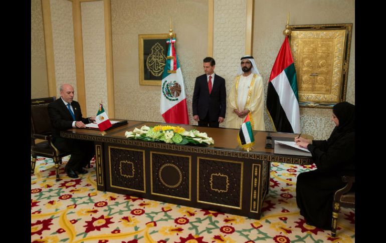 Economía | Firman documentos en el sector turístico, energético y asuntos con el cambio climático México y Emiratos Árabes presencian firma de acuerdos Firman documentos en el sector turístico, energético y en asuntos relacionados con el cambio climático Por: NTX 19 de enero de 2016 - 12:55 hs El Mandatario y el jeque Mohammed Bin Rashid, atestiguaron la firma de 13 convenios. NTX / Especial DUBAI, EMIRATOS ÁRABES UNIDOS (19/ENE/2016).- El Presidente Enrique Peña Nieto y el vicepresidente, primer ministro de los Emiratos Árabes Unidos y gobernante de Dubai, jeque Mohammed Bin Rashid Al Maktoum, atestiguaron la firma de 13 convenios entre ambos países. Durante una reunión en el Palacio Zabeel, el Mandatario mexicano y su anfitrión dieron fe sobre la adopción de estos instrumentos que impulsarán la relación bilateral. Entre los documentos signados están los acuerdos para la Promoción y Protección Recíproca de Inversiones, así como de cooperación en materias turística, en el sector energético, en energías limpias y en asuntos energéticos relacionados con el cambio climático. De igual manera para el Establecimiento de un Programa Conjunto de Becas entre el Consejo Nacional de Ciencia y Tecnología (Conacyt) y el Instituto Masdar para Ciencia y Tecnología. También se firmaron varios memorándum de entendimiento: sobre Cooperación Cultural y Artística; para Promover la Cooperación en las Áreas de Educación Superior e Investigación Científica. Así como entre la Federación de Cámaras de Comercio e Industria de Emiratos Árabes Unidos y el Consejo Empresarial Mexicano de Comercio Exterior, Inversión y Tecnología (Comce). Mientras que el Banco Nacional de Comercio Exterior (Bancomext) firmó un acuerdo de cooperación con Emirates Development Bank y dos memoranda de entendimiento: con Emirates National Bank of Dubai y con Dubai Economic Council. Petróleos Mexicanos ( Pemex), a su vez, firmó un memorándum de entendimiento no vinculante y acuerdos de cooperación con las empresas Abu Dhabi National Oil Company (ADNOC) y Mubadala Petroleum LLC. Temas Reforma Energética Economía Mexicana Giras presidenciales Enrique Peña Nieto Arabia Saudita Lee También México busca frenar el paso perfecto de Argentina en Mundial Sub-20 ¿Dónde ver EN VIVO el partido amistoso México vs Colombia? Dónde ver EN VIVO el México vs Argentina por el Mundial Sub-20 La actualidad de Diego Ochoa, formado en Chivas y destacado en el Mundial Sub-20 Recibe las últimas noticias en tu e-mail Todo lo que necesitas saber para comenzar tu día Registrarse implica aceptar los Términos y Condiciones