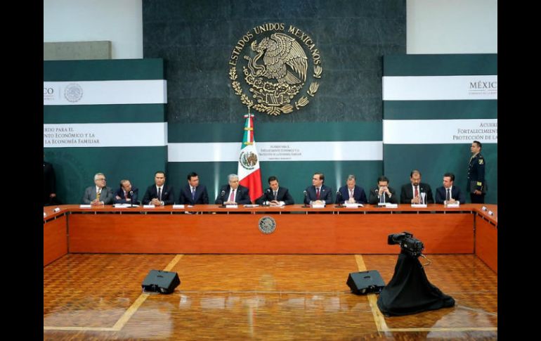 CIUDAD DE MÉXICO (09/ENE/2017).- El Presidente Enrique Peña Nieto señaló que el Acuerdo para el Fortalecimiento Económico y Protección de la Economía Familiar busca "cuidar la economía de las familias mexicanas".Atestiguó la firma del Acuerdo que realizaron empresarios y líderes sindicales esta tarde en Los Pinos, en el que pactaron coadyuvar para no incurrir en un aumento indiscriminado del precio de productos de la canasta básica, así como impulsar inversiones y proteger el empleo de las familias mexicanas, luego del ajuste al precio de las gasolinas."Lo que hoy nos convoca es dar marco a un acuerdo que nos permita emprender acciones, que nos permita ser sensibles a estas definiciones que se han tomado para, con sentido de solidaridad y de responsabilidad social, acompañar a los sectores menos favorecidos para cuidar de la estabilidad de precios, la estabilidad de economía, para cuidar la economía de las familias mexicanas", dijo el Presidente.Peña agradeció al sector empresarial, quien "asume el compromiso de coadyuvar para no incurrir en un aumento indiscriminado de precios de los productos básicos. Esto es posible porque la gasolina sólo representa una fracción del costo de la producción".El Mandatario indicó que dicho Acuerdo “atiende las preocupaciones de las familias mexicanas”, a quienes les preocupa el empleo, así como el aumento en otros productos y en el transporte público, dijo Peña Nieto.Acompañado de miembros del gabinete económico, Peña Nieto aseveró que su administración hará todo lo posible para que "el ajuste en la gasolina impacte lo menos posible en la economía familiar".Durante el evento, en el que se encuentran los secretarios del gabinete económico, Peña Nieto reiteró que "el ajuste (en el precio de las gasolinas) no es consecuencia de la reforma energética, ni de la hacendaria, sino refleja directamente el incremento internacional que se ha dado al precio de la gasolina".Como en su mensaje emitido la semana pasada sobre el llamado gasolinazo, el Mandatario indicó que de no haber realizado el "ajuste" a los precios de la gasolina el Gobierno federal habría tenido que realizar recortes en los programas sociales, con lo que se afectaría a los "sectores menos favorecidos".En el acuerdo se confirma que adicionalmente a los ajustes aprobados por el Legislativo, el Gobierno federal establecerá otras medidas de austeridad, incluyendo reducir en 10% la partida de sueldos y salarios de servidores públicos de mando superior de dependencias federales.“Se exhorta a los otros Poderes de la Federación, a los Organismos Autónomos, así como a los gobiernos locales, para que adopten medidas similares”, se señala en una versión del documento.De acuerdo con este texto, el Acuerdo tiene como objetivo principal impulsar los proyectos de inversión programados para 2017 y 2018, y fomentar nuevas inversiones , mantener la creación de empleos, el crecimiento económico y la competitividad.