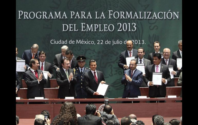 Economía | Reitera que es obligación del Estado crear más empleos formales y productivos Peña Nieto firma Pacto contra el empleo informal Reitera que es obligación del Estado crear más empleos formales y productivos Por: SUN 22 de julio de 2013 - 14:39 hs Enrique Peña Nieto presenta el Programa para la Formalización del Empleo 2013 junto a gobernadores de los estados. SUN / CIUDAD DE MÉXICO (22/JUL/2013).- El Presidente Enrique Peña Nieto dijo este lunes que en la actualidad el 59 por ciento de la población laboral lo realiza de manera informal, por lo que es obligación del Estado crear más empleos formales y más productivos. En el marco de la firma del "Pacto para la Formalización del Empleo 2013" que suscribieron los estados del país y el Distrito Federal con el Gobierno Federal, Peña Nieto indicó que "la informalidad afecta al trabajador y a toda su familia". Temas Economía Mexicana Enrique Peña Nieto Empleo Lee También México cae ante Argentina y es eliminado del Mundial Sub-20 Estos son los depósitos que son revisados por el SAT México vs Colombia • Momentos destacados • Partido amistoso Infonavit: Esta es la edad máxima para solicitar un crédito en 2025 Recibe las últimas noticias en tu e-mail Todo lo que necesitas saber para comenzar tu día Registrarse implica aceptar los Términos y Condiciones
