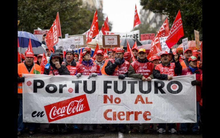 Economía | Miles se manifiestan por el cierre que afectará a mil 253 trabajadores Protestan por cierre de plantas de Coca Cola en España Las embotelladoras en Madrid, Palma de Mallorca, Oviedo y Alicante cerrarán y parte de la organización será reubicada Por: NTX 15 de febrero de 2014 - 10:06 hs La manifestación de Madrid reúne a miles de personas. AFP / MADRID, ESPAÑA (15/FEB/2014).- Miles de personas protestaron hoy en varias ciudades españolas contra el cierre de cuatro plantas de la multinacional Coca Cola en este país, que afectará a mil 253 trabajadores. La empresa Coca Cola Iberian Partners anunció en fecha reciente el cierre de sus embotelladoras en Madrid, Palma de Mallorca, Oviedo y Alicante, y la posterior reubicación de una parte de la organización a otras plantas en el país. En la manifestación de Madrid, el secretario general de Comisiones Obreras (CCOO), Ignacio Fernández Toxo, expresó que se trata de una compañía con grandes beneficios económicos por lo que no hay justificación para el despido de trabajadores. Criticó que se trata de una decisión "que se tomó a miles de kilómetros, en Atlanta", Estados Unidos, y que se trata de un expediente de regulación de empleo "salvaje". El secretario general de la Unión General de Trabajadores (UGT), Cándido Méndez, pidió por su parte a la empresa retirar la medida y trabajar sobre un nuevo plan industrial que impida más despidos. "Es una muestra de torpeza y de insensibilidad absoluta", manifestó Méndez, tras ironizar que la multinacional "ha dejado de ser la chispa de la vida", en referencia al marketing de Coca Cola. La manifestación de Madrid reunió a miles de personas y recorrió la calle Fuencarral desde la glorieta de Bilbao hasta la Gran Vía, y transcurrió sin incidentes. Temas Empresas España Desempleo Manifestaciones en el mundo Crisis Coca Cola Lee También CEO de Coca-Cola aclara si retiraría patrocinio del Super Bowl Sociales: El Informador inicia una nueva etapa con la moderna imprenta "Doña Stella" SEP: ¿La Constancia de Situación Profesional facilita encontrar empleo? Sociales: Nice de México celebra su 29 aniversario Recibe las últimas noticias en tu e-mail Todo lo que necesitas saber para comenzar tu día Registrarse implica aceptar los Términos y Condiciones