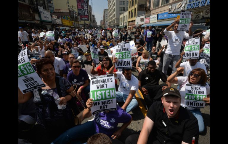 Economía | Realizan un paro de labores que se prevé dure cerca de 12 horas Se manifiestan trabajadores de comida rápida en EU Realizan un paro de labores que se prevé dure cerca de 12 horas Por: EL INFORMADOR 4 de septiembre de 2014 - 15:44 hs Manifestantes piden un aumento de salario de 7.25 dólares la hora a 15 dólares por hora. AFP / GUADALAJARA, JALISCO (04/SEP/2014).- Miles de trabajadores de establecimientos de comida rápida, salieron a las calles de Estados Unidos para pedir un aumento al salario mínimo, haciendo un paro de labores que inició este jueves y pretende que dure cerca de 12 horas. Los trabajadores demandan principalmente aumento salarial, derecho a la sindicalización y mayor dignidad en la industria de los establecimientos de comida rápida. Organizadores convocaron a trabajadores de 150 ciudades de todo Estados Unidos, para comenzar con la manifestación para después salir a las calles con pancartas y dar a conocer sus necesidades. Actualmente, el salario mínimo de trabajadores de comida rápida es de 7.25 dólares la hora, por lo que piden que aumente a 15 dólares. La manifestación también ha llegado a redes sociales, pues con el hashtag #FastFoodGlobal se han compartido imágenes de quiénes protestan y algunas opiniones al respecto. En Facebook también circulan videos y fotografías de las protestas. Aquí un video EL INFORMADOR / CAROLINA QUINTANILLA Temas Economía Internacional Estados Unidos Manifestaciones en el mundo Lee También Afectaciones en México por el frente frío núm. 9 HOY Peso mexicano, IMPARABLE frente a la divisa estadounidense Vienen más lluvias fuertes para zonas afectadas por tormentas pasadas Trayectoria de la tormenta tropical "Melissa" en el mar Caribe Recibe las últimas noticias en tu e-mail Todo lo que necesitas saber para comenzar tu día Registrarse implica aceptar los Términos y Condiciones